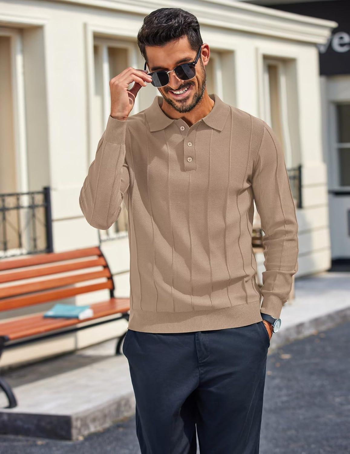 COOFANDY Mens Knit Long Sleeve Polo Sweater Business Casual Collared Golf Sweaters Ribbed Textured Activewear Polos(Khaki)