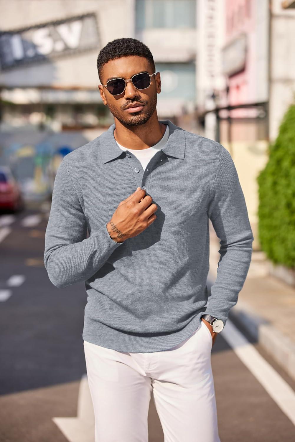 COOFANDY Men’s Knit Polo Long Sleeve Sweaters Collared Polo Sweater Casual Dress Pullover Fashion Golf Sweaters(Light Grey)