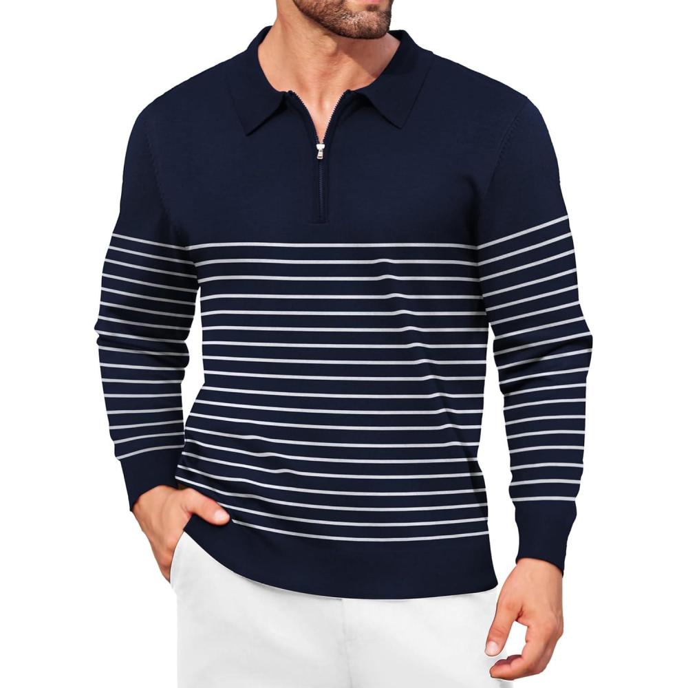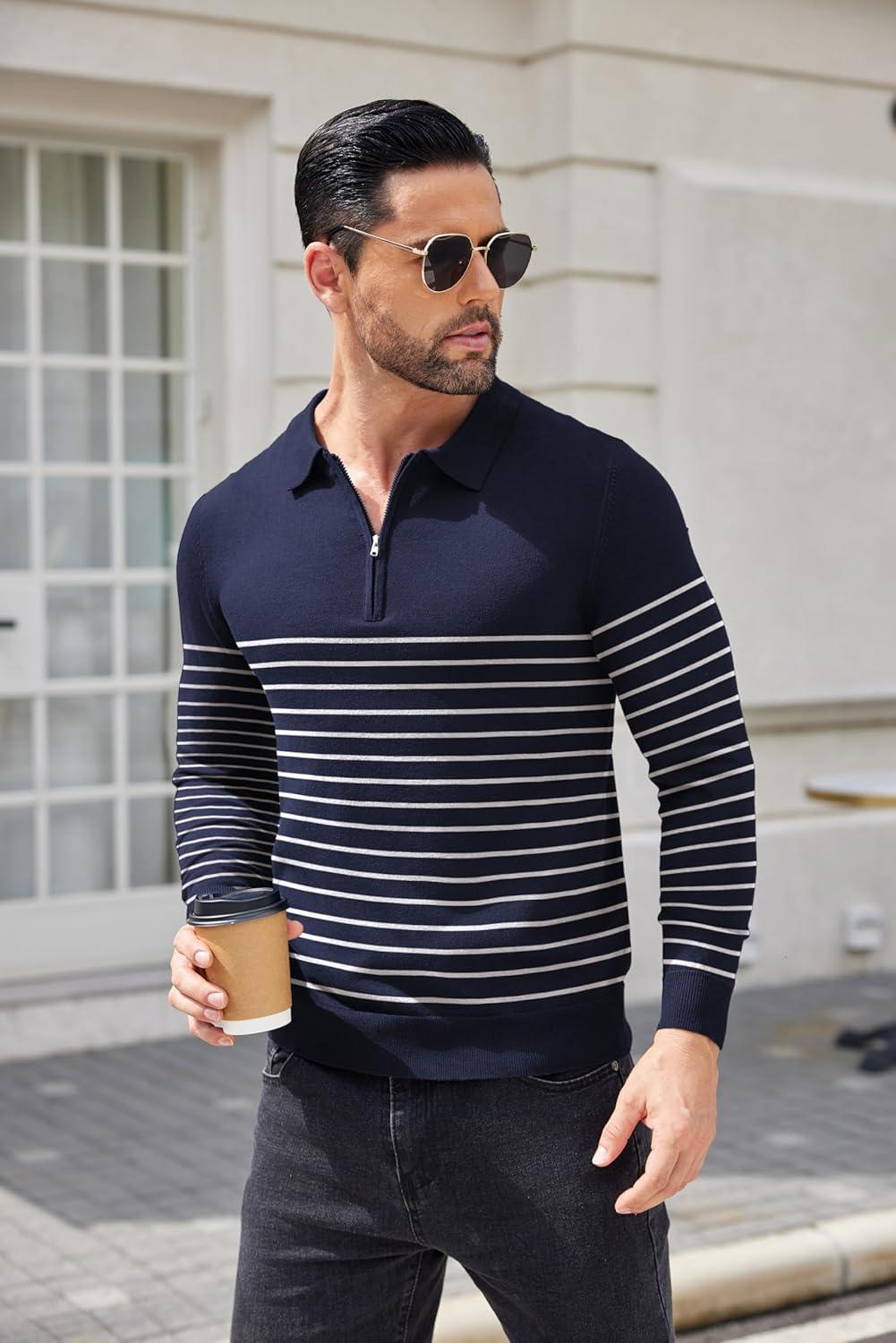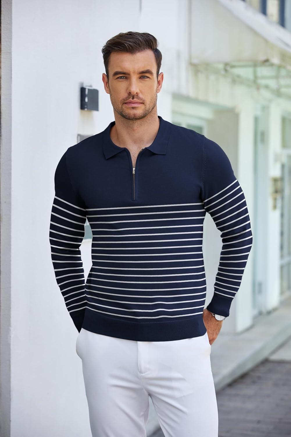 COOFANDY Mens Knit Polo Shirt Quarter Zip Slim Fit Pullover Long Sleeve Sweater Polo(Navy Blue (White Stripes))