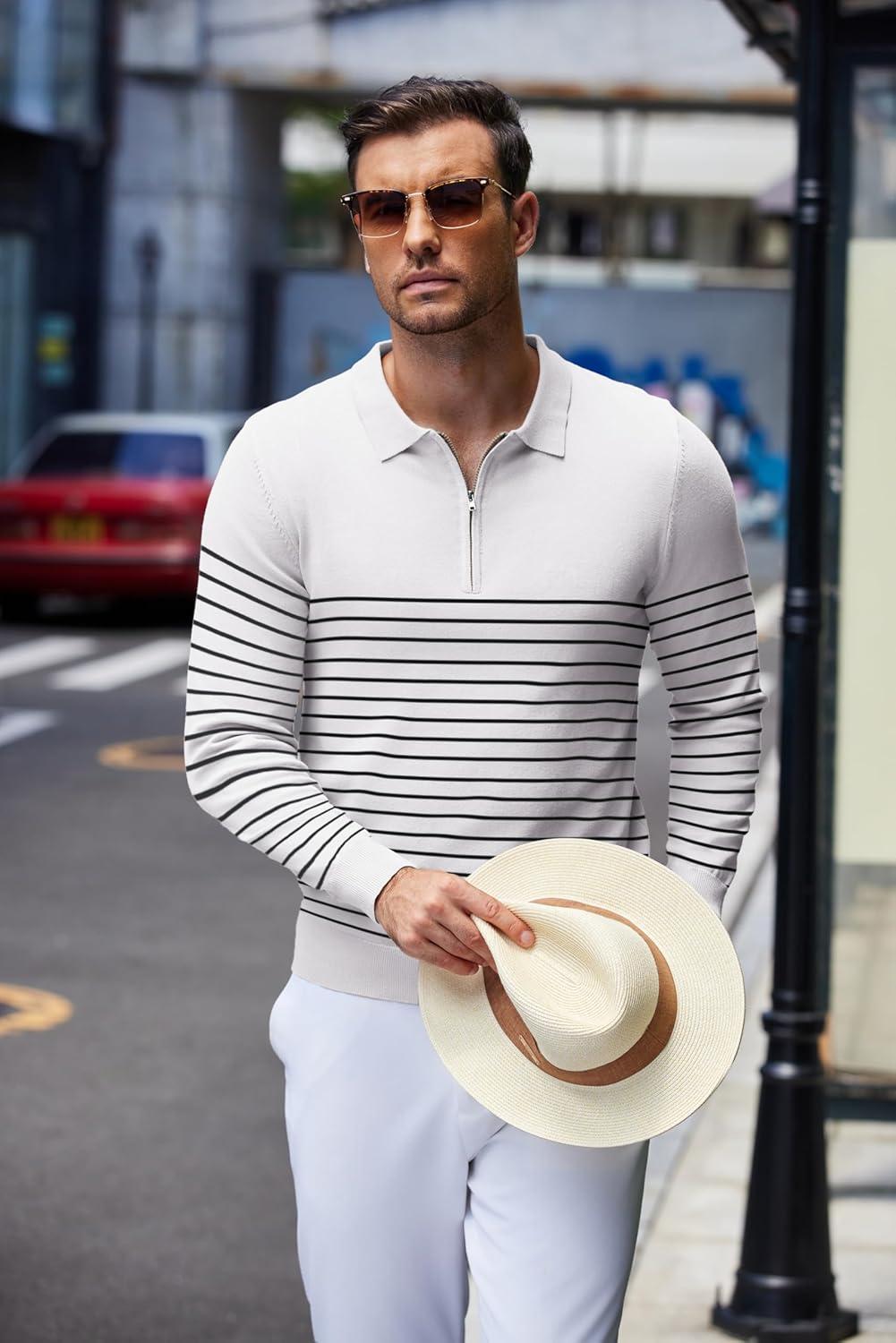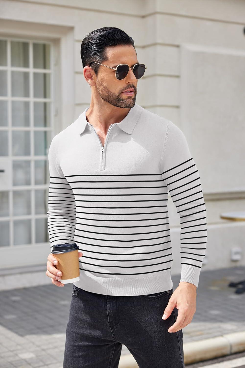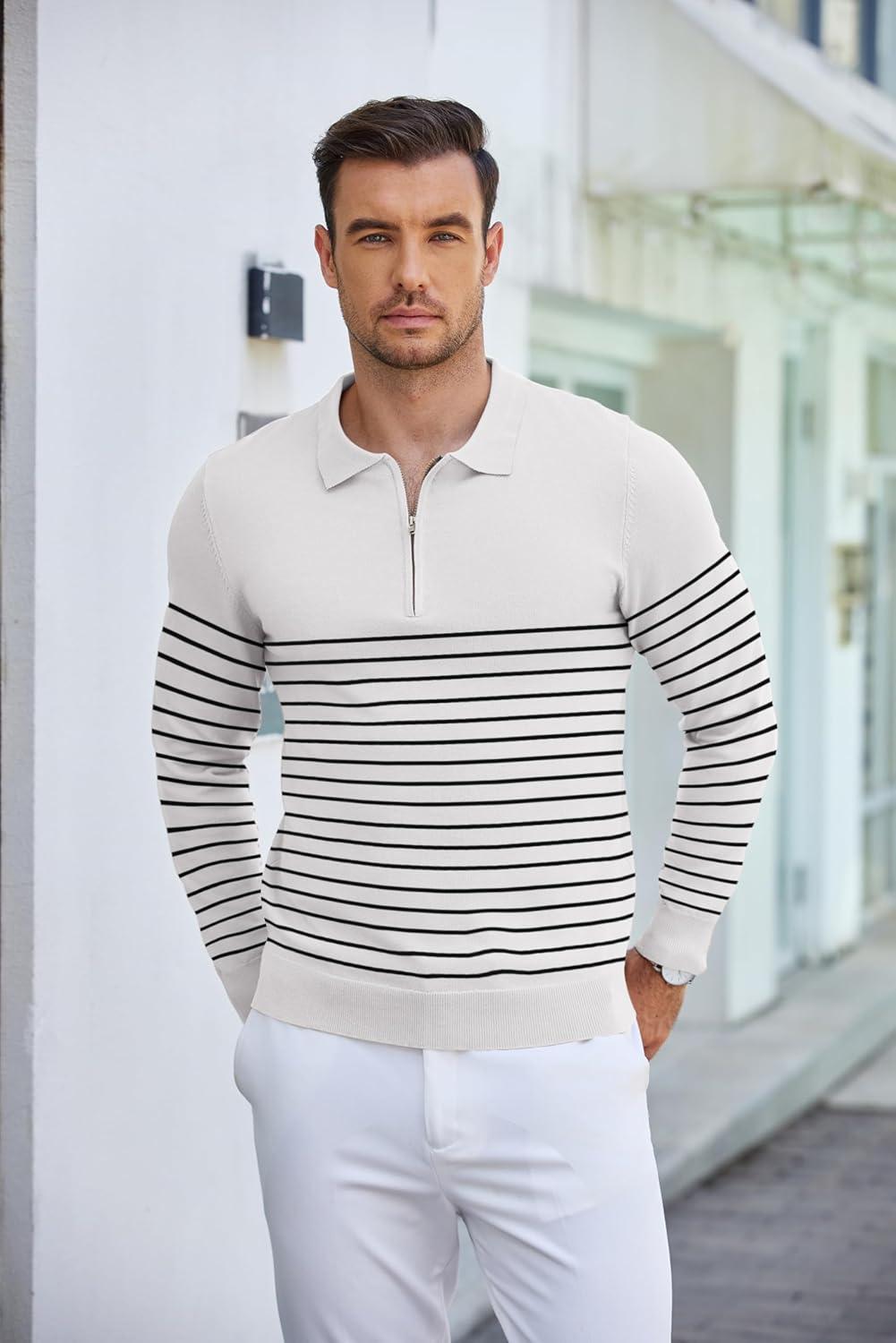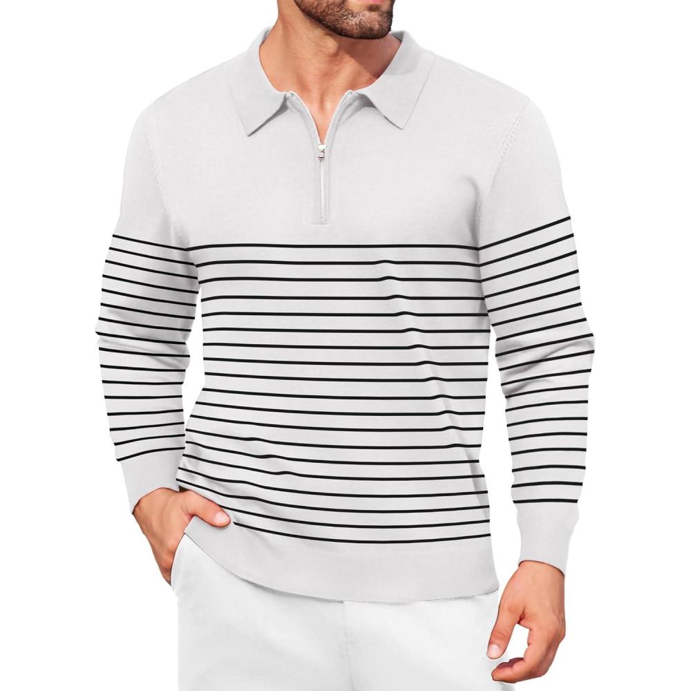 COOFANDY Mens Knit Polo Shirt Quarter Zip Slim Fit Pullover Long Sleeve Sweater Polo(White (Black Stripes))