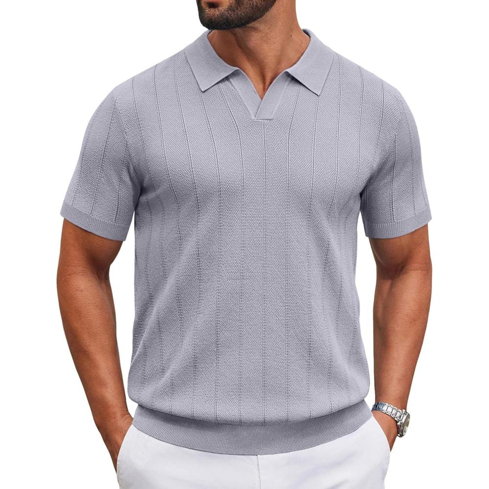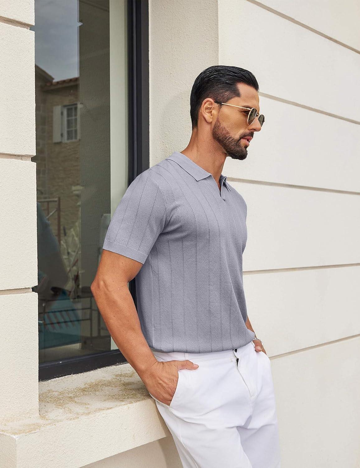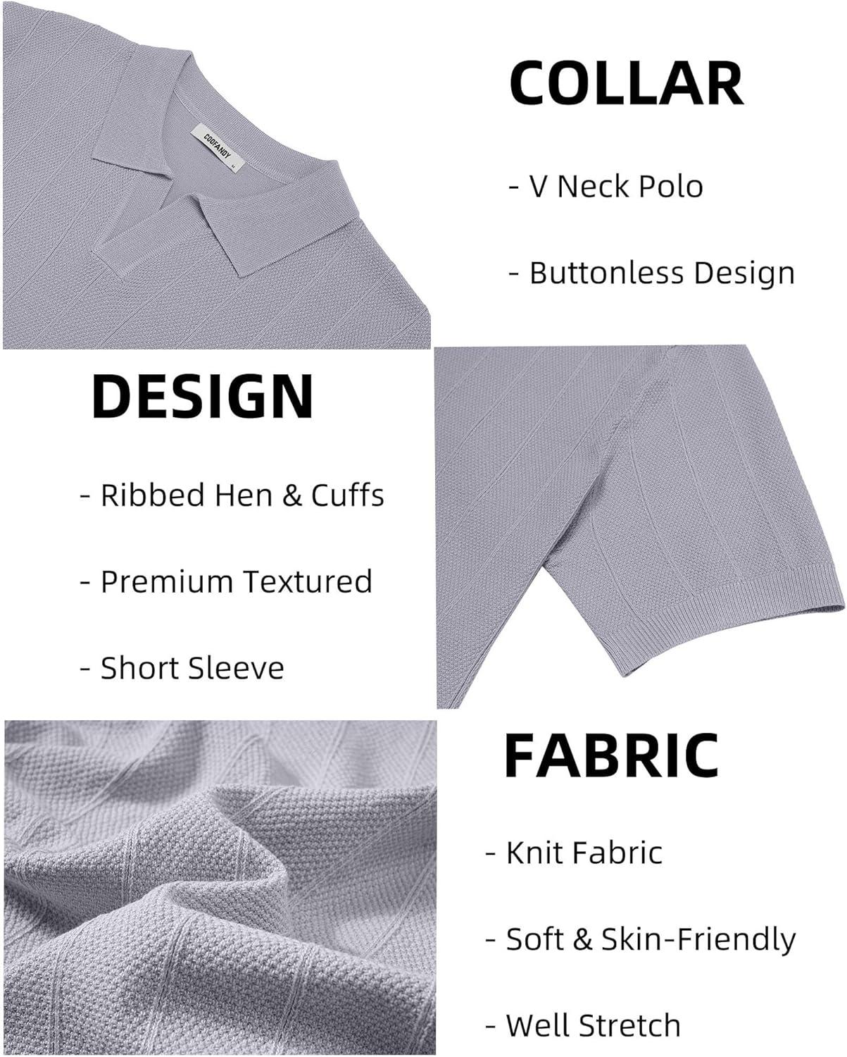 COOFANDY Mens Knit Polo Shirts V Neck Short Sleeve Ribbed Textured Polo Shirt Stretch Casual Golf Shirts Collared T Shirt(Light Gray)