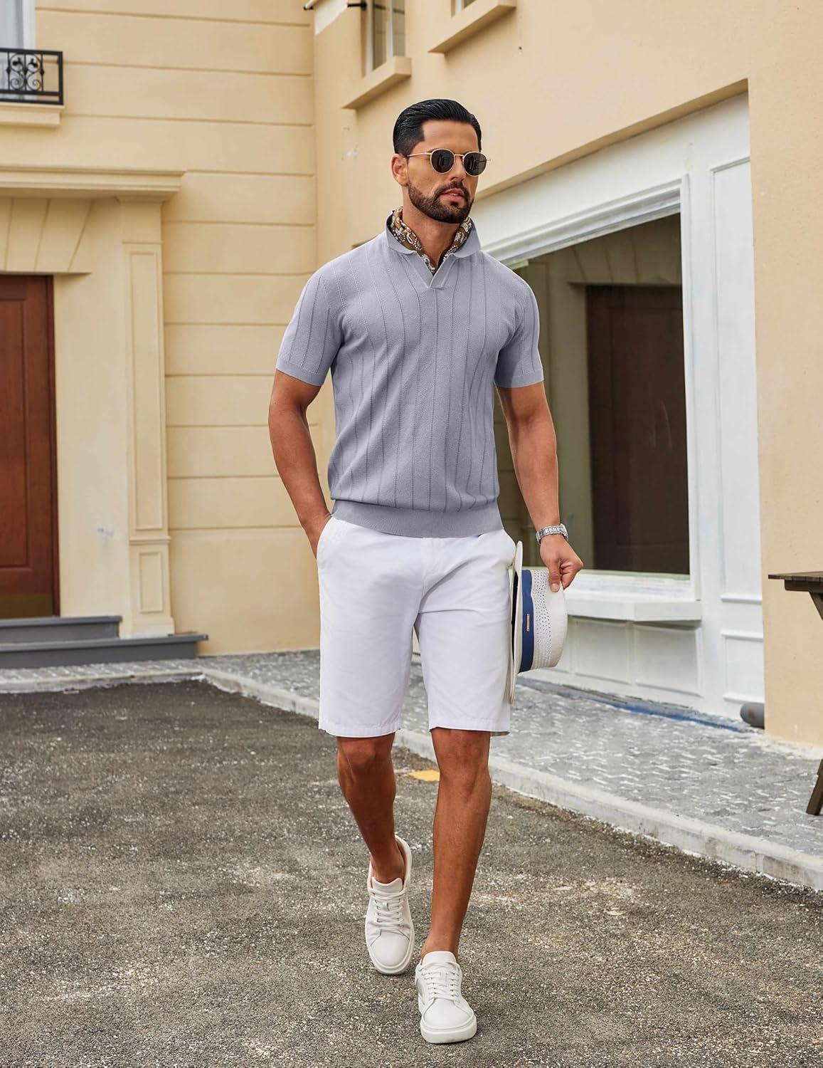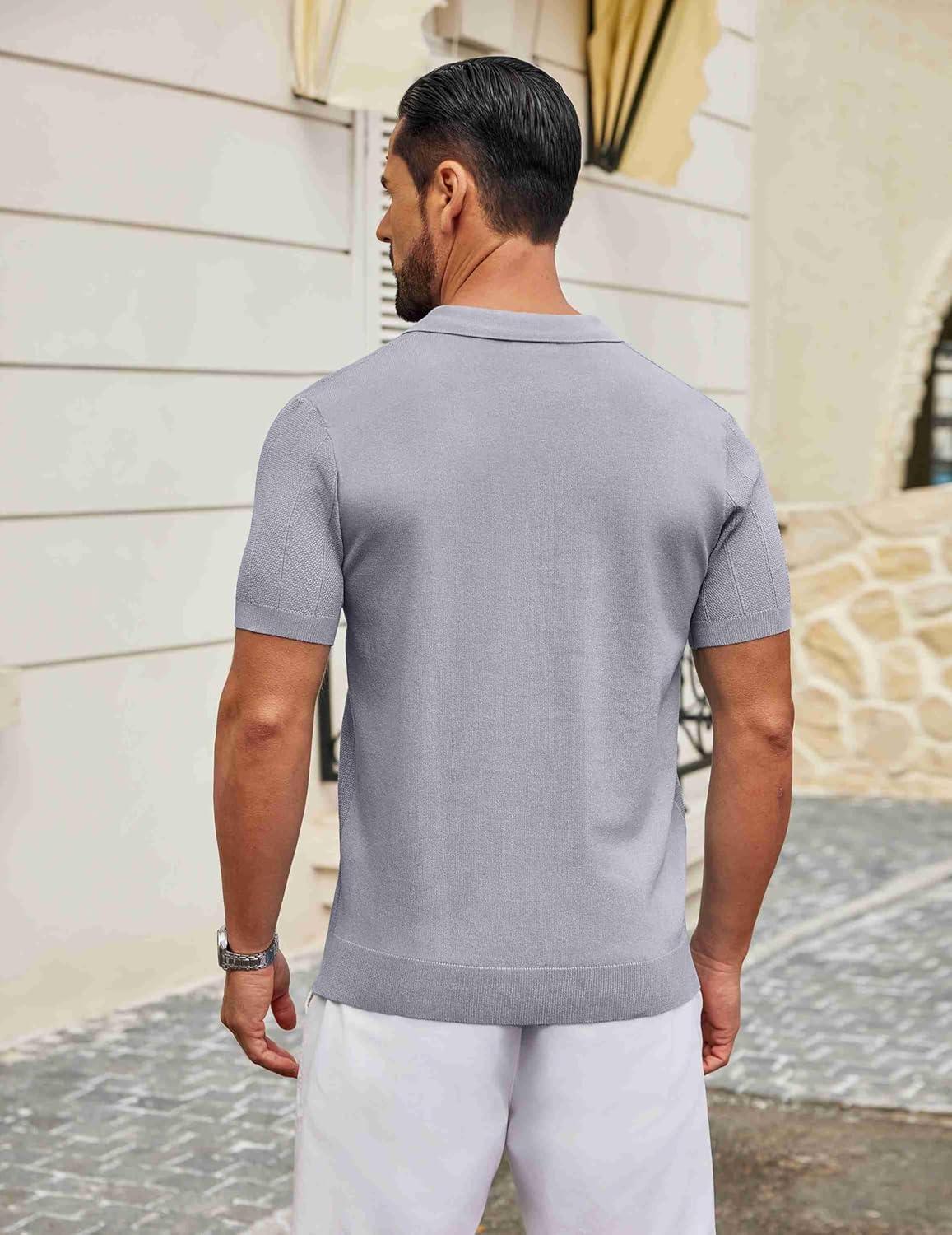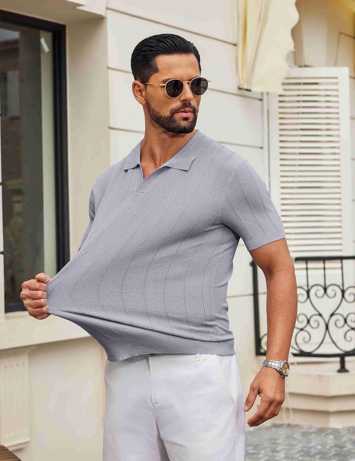COOFANDY Mens Knit Polo Shirts V Neck Short Sleeve Ribbed Textured Polo Shirt Stretch Casual Golf Shirts Collared T Shirt(Light Gray)