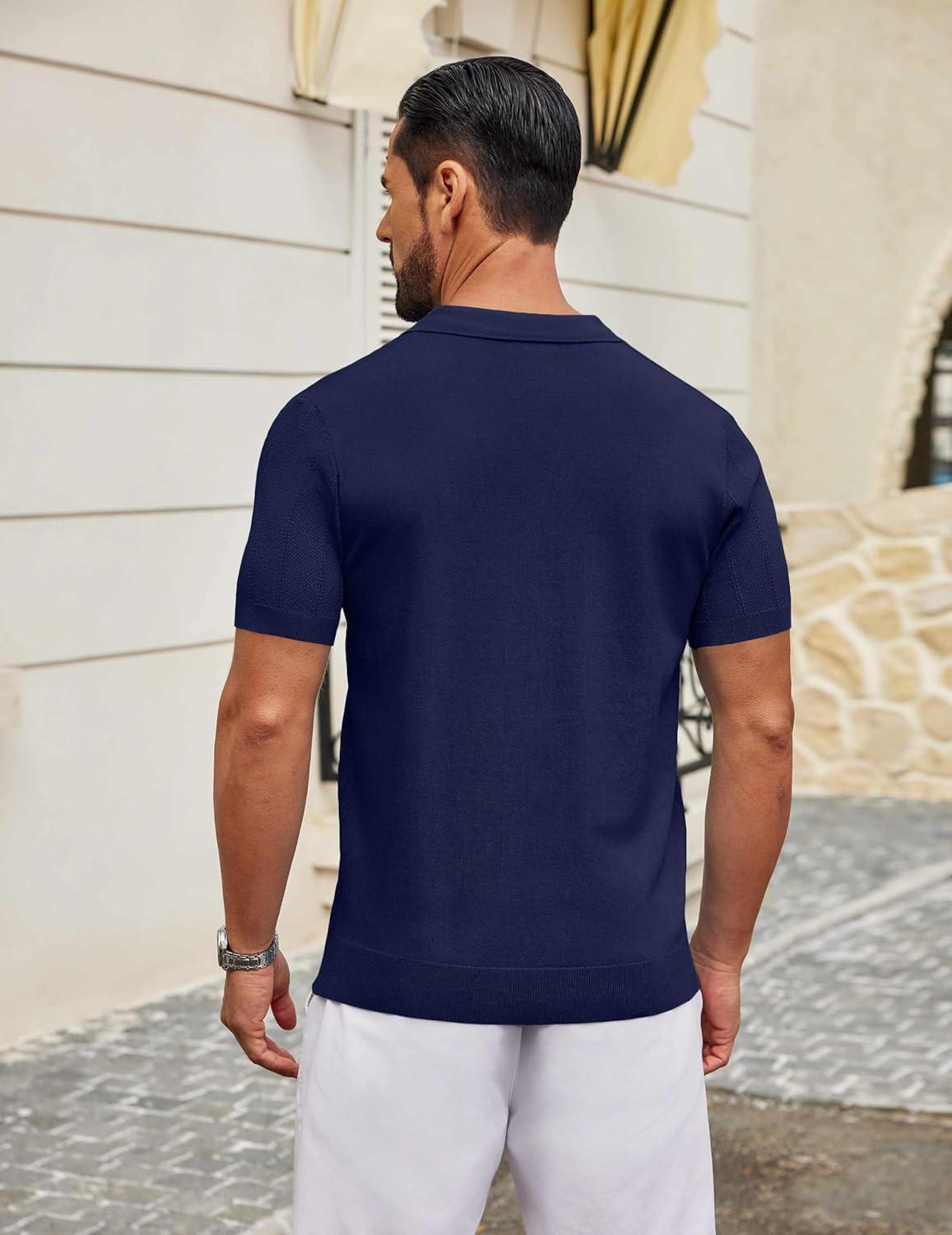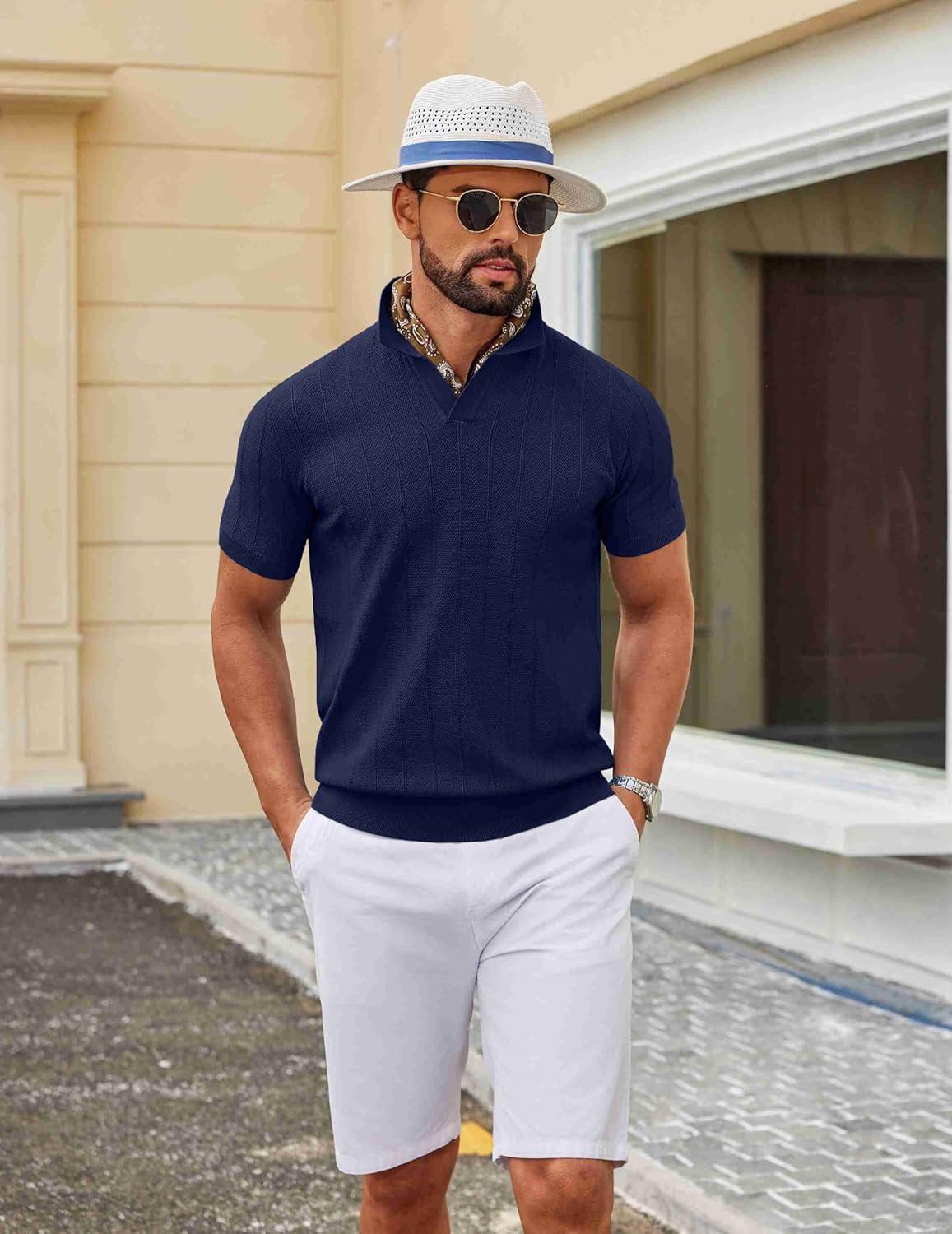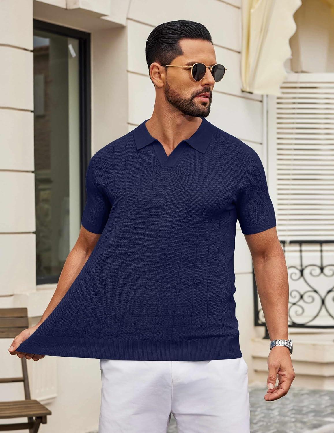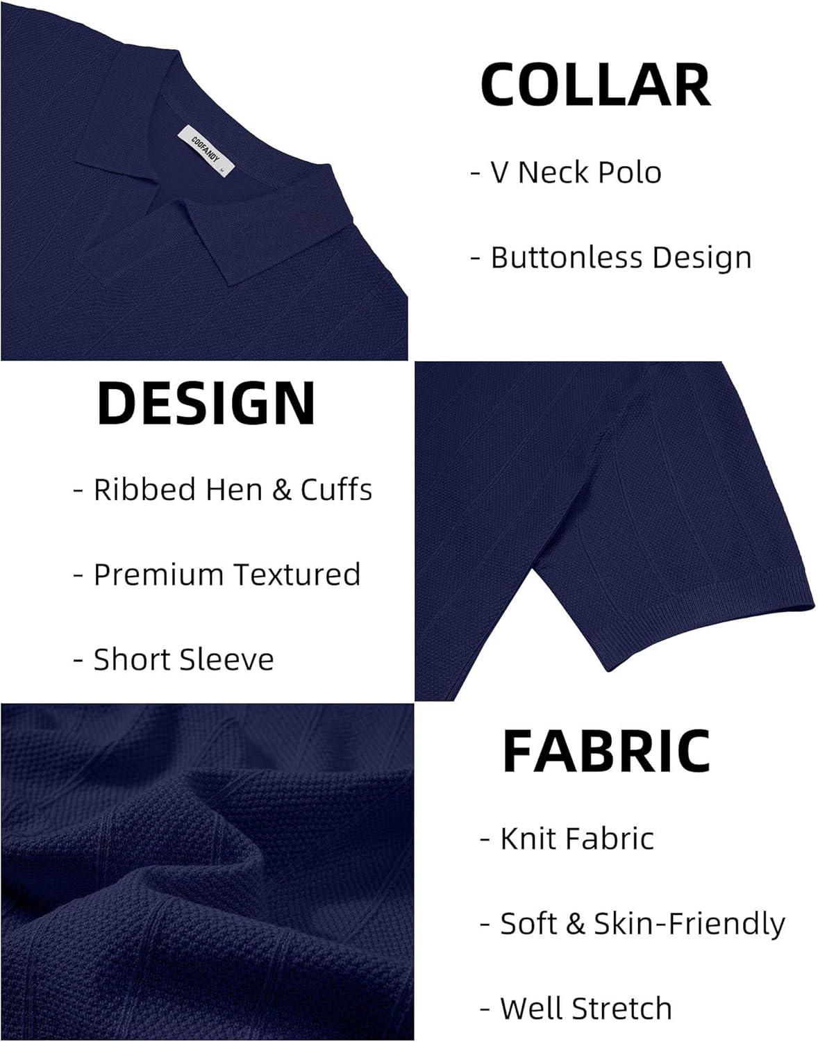 COOFANDY Mens Knit Polo Shirts V Neck Short Sleeve Ribbed Textured Polo Shirt Stretch Casual Golf Shirts Collared T Shirt(Navy Blue)
