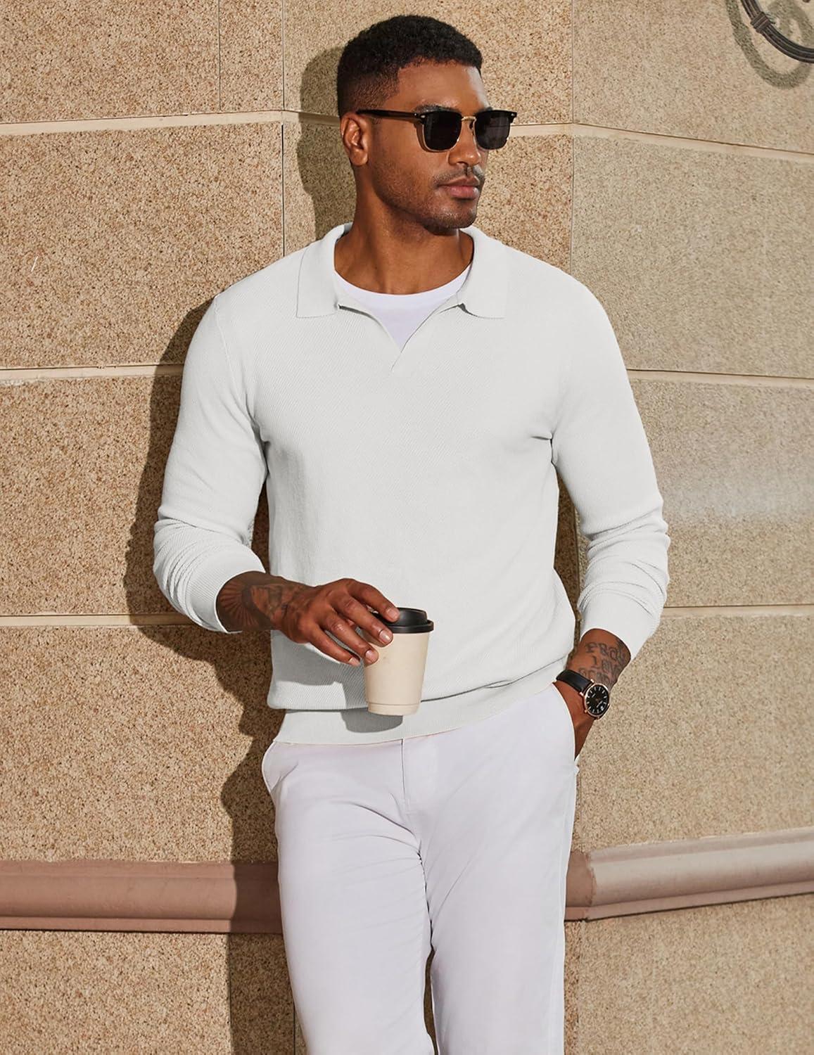 COOFANDY Men’s Knit Polo Sweater Long Sleeve V-Neck Pullover Sweaters Casual Collared Ribbed Knitted Polos(White)