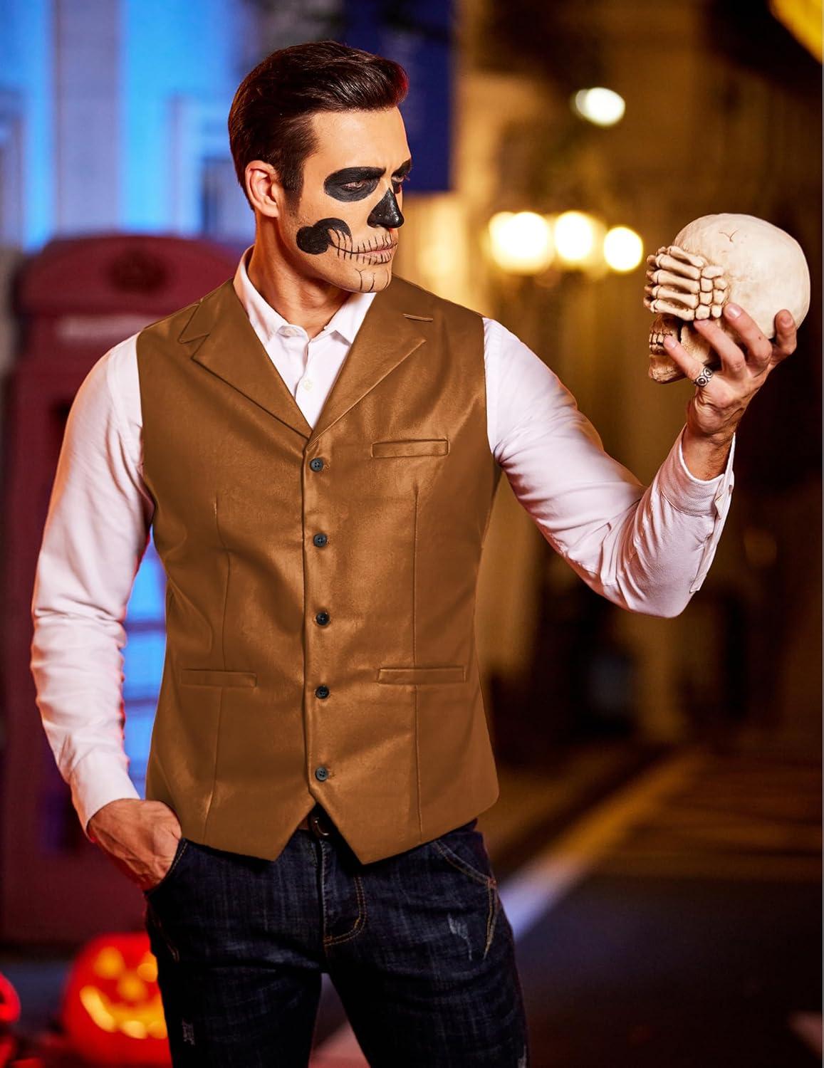 COOFANDY Men’s Leather Suit Vest Casual Western Vest Jacket Lightweight V-Neck Dress Waistcoats Halloween Costumes(Dark Brown)