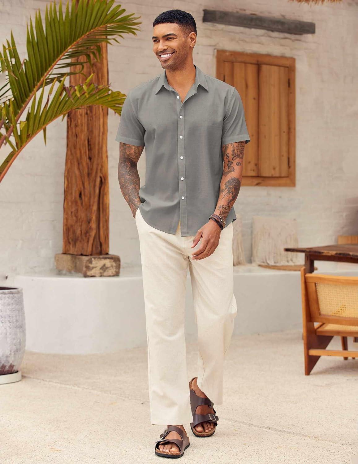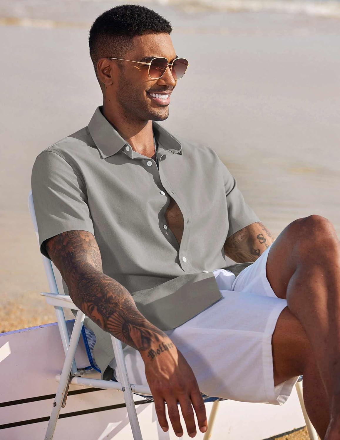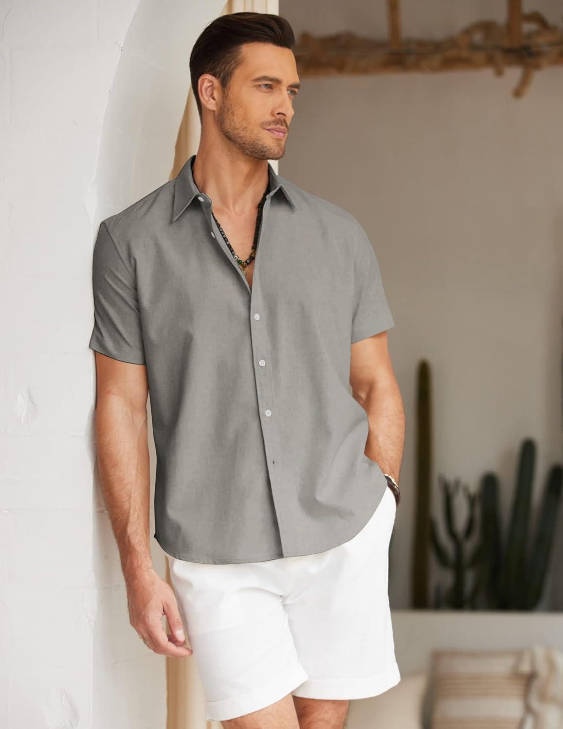 COOFANDY Mens Linen Casual Short Sleeve Shirt Button Down Summer Beach Shirts(Grey)