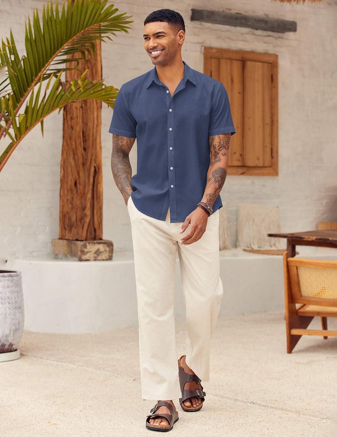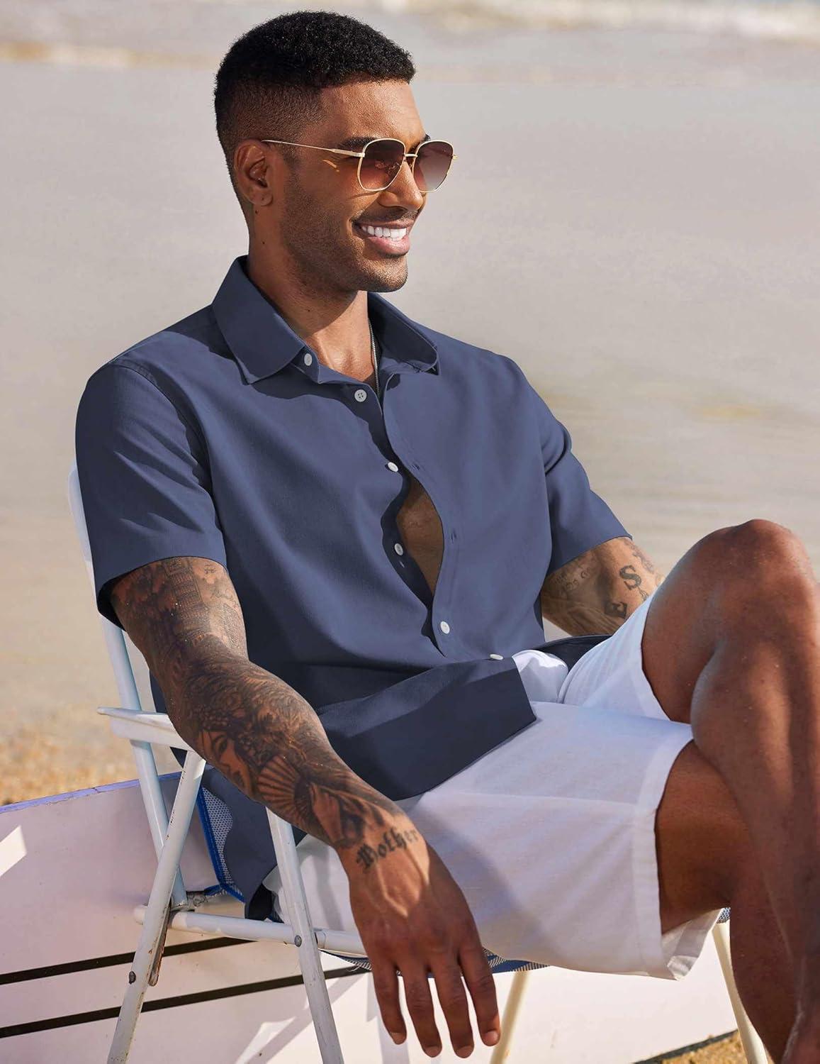 COOFANDY Mens Linen Casual Short Sleeve Shirt Button Down Summer Beach Shirts(Navy Blue)