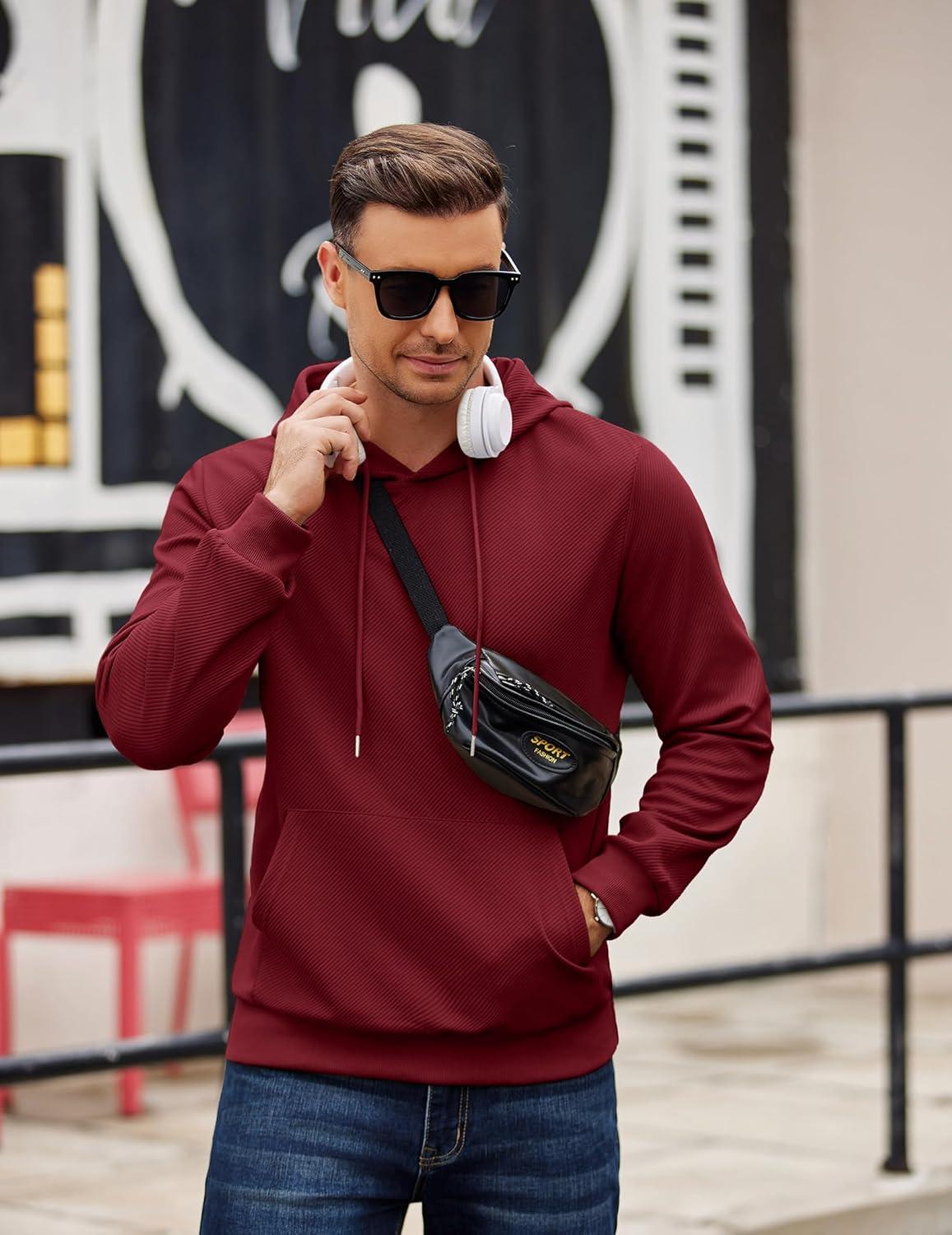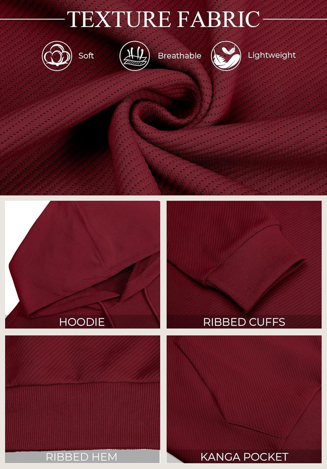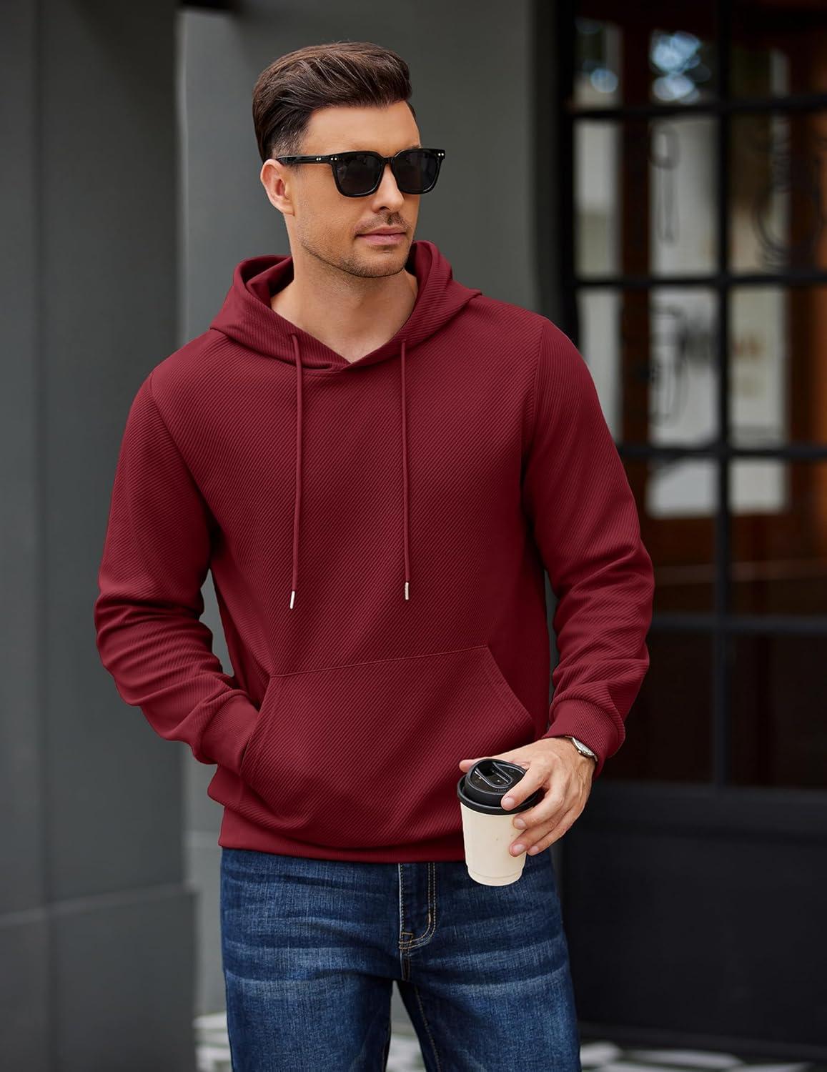 COOFANDY Men’s Long Sleeve Hooded Sweatshirt Casual Lightweight Hoodies Pullover Textured Drawstring Hoodie with Kanga Pocket(Wine Red)