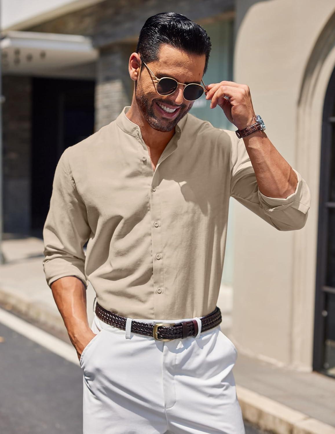 COOFANDY Men’s Long Sleeve Oxford Dress Shirts Chambray Button Down Shirt Casual Band Collar Shirts(Khaki)