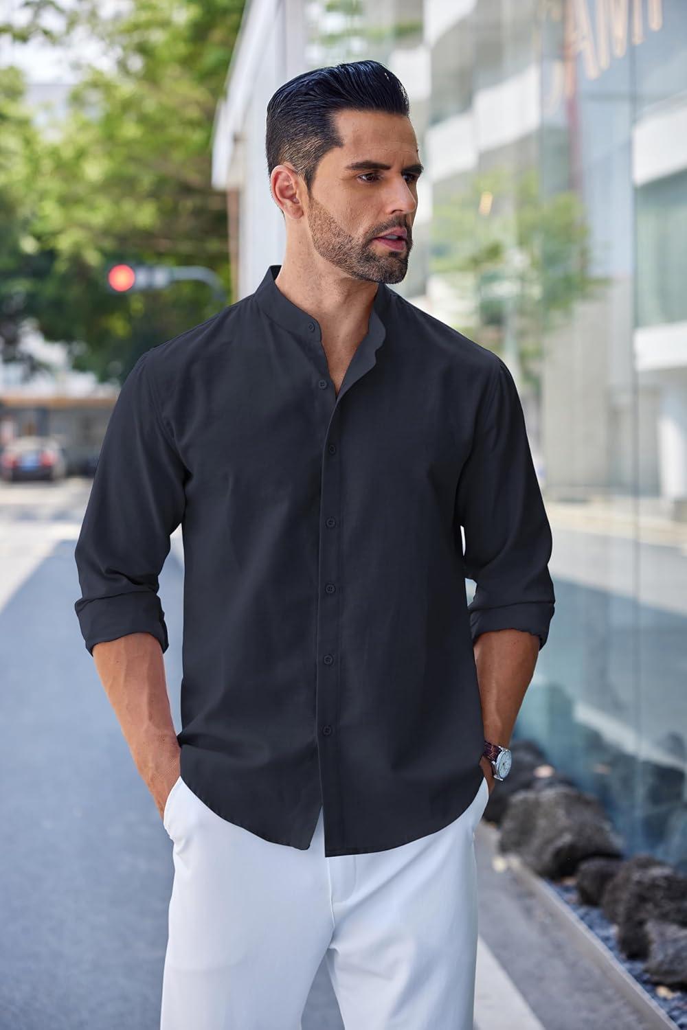 COOFANDY Men’s Long Sleeve Oxford Dress Shirts Chambray Button Down Shirt Casual Band Collar Shirts(Navy Blue)