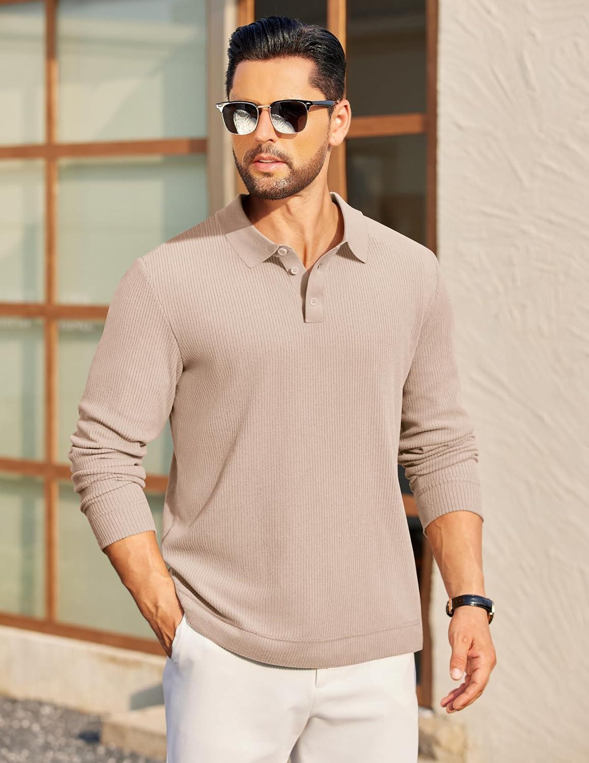 COOFANDY Mens Long Sleeve Polo Knit Polo Sweater Collared Pullover Casual Golf Polo Sweater(Light Brown)