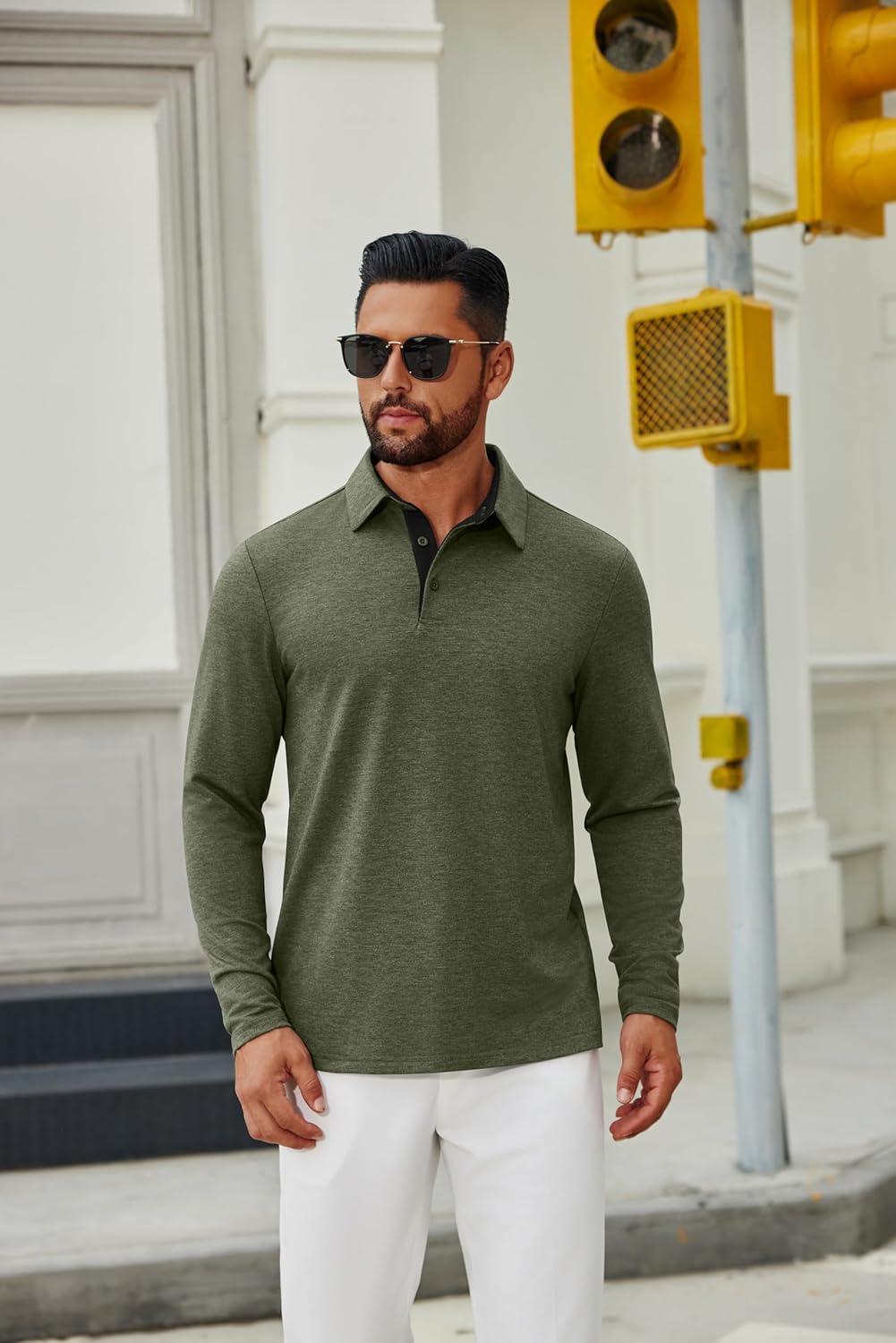 COOFANDY Mens Long Sleeve Polo Shirts Button Casual Tee Collared Work Pullover Shirts(Army Green)