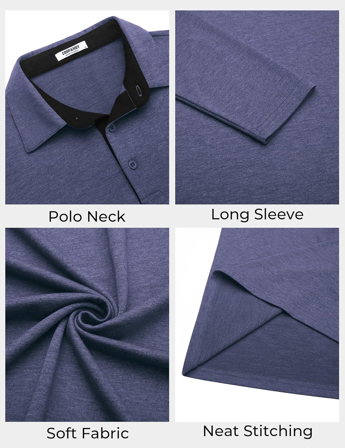 COOFANDY Mens Long Sleeve Polo Shirts Button Casual Tee Collared Work Pullover Shirts(Navy Blue)