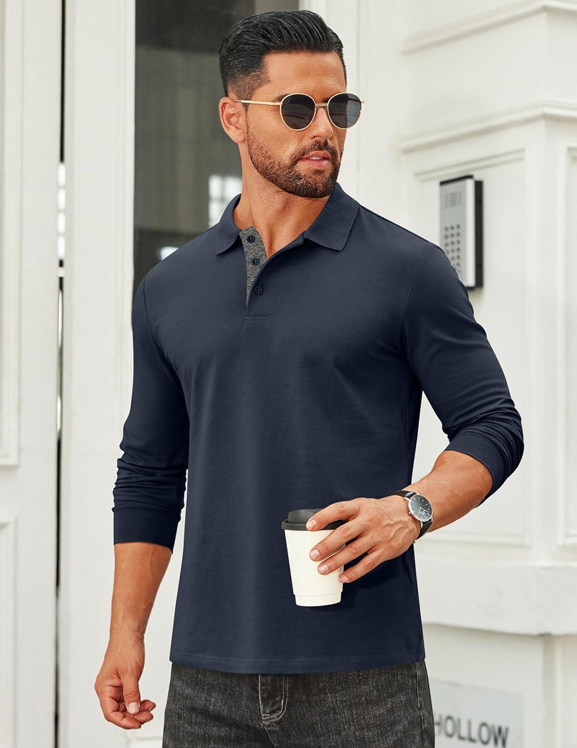 COOFANDY Mens Long Sleeve Polo Shirts Cotton Collared Shirts Casual Business Polo Classic Golf T Shirts(Navy Blue)
