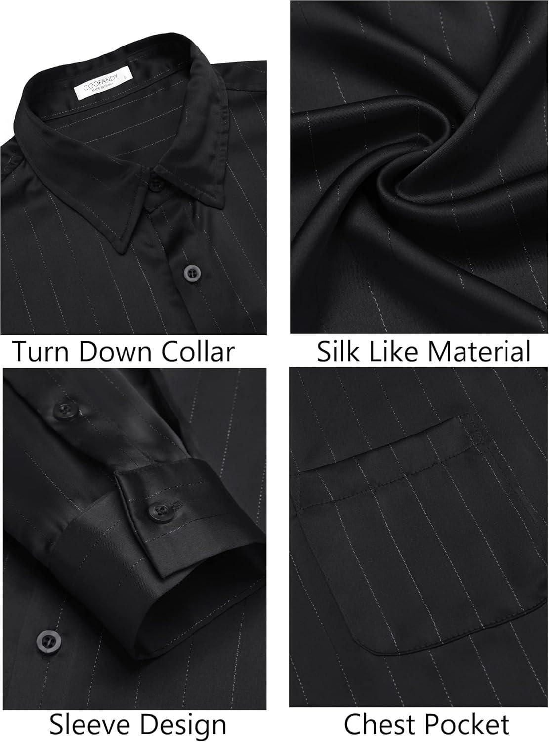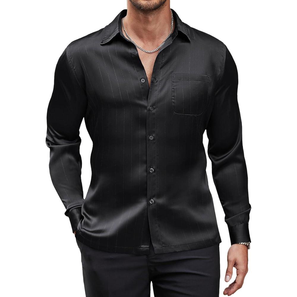 COOFANDY Mens Luxury Satin Dress Shirt Shiny Silk Long Sleeve Button Up Shirts Wedding Shirt Party Prom(Black)