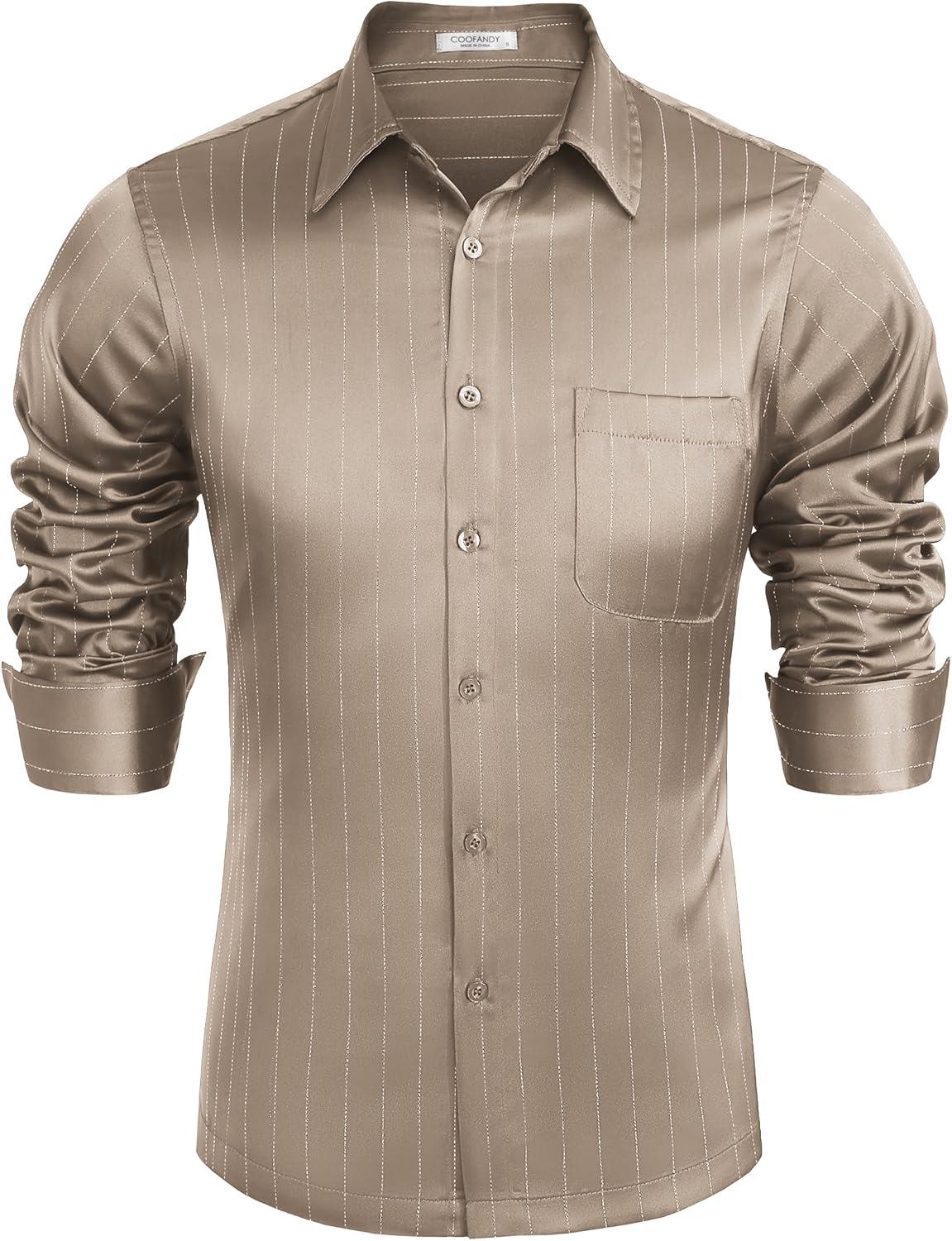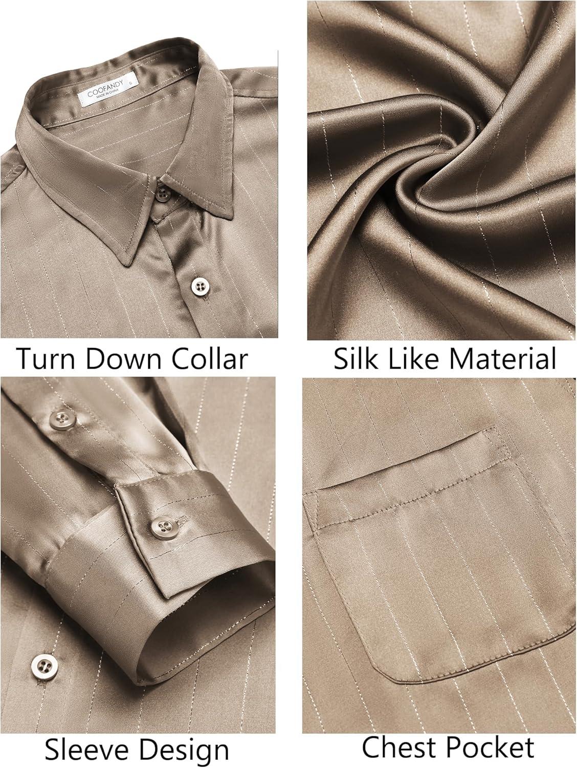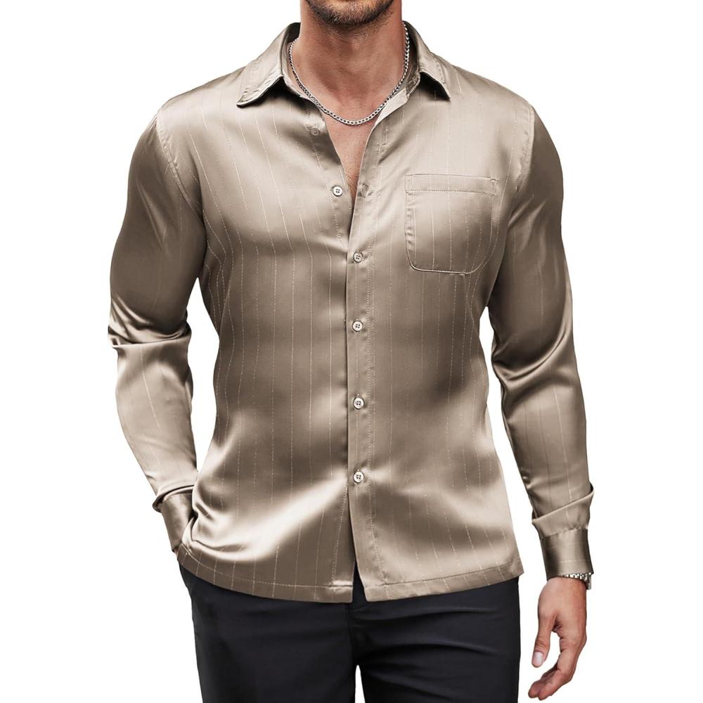 COOFANDY Mens Luxury Satin Dress Shirt Shiny Silk Long Sleeve Button Up Shirts Wedding Shirt Party Prom(Champagne)
