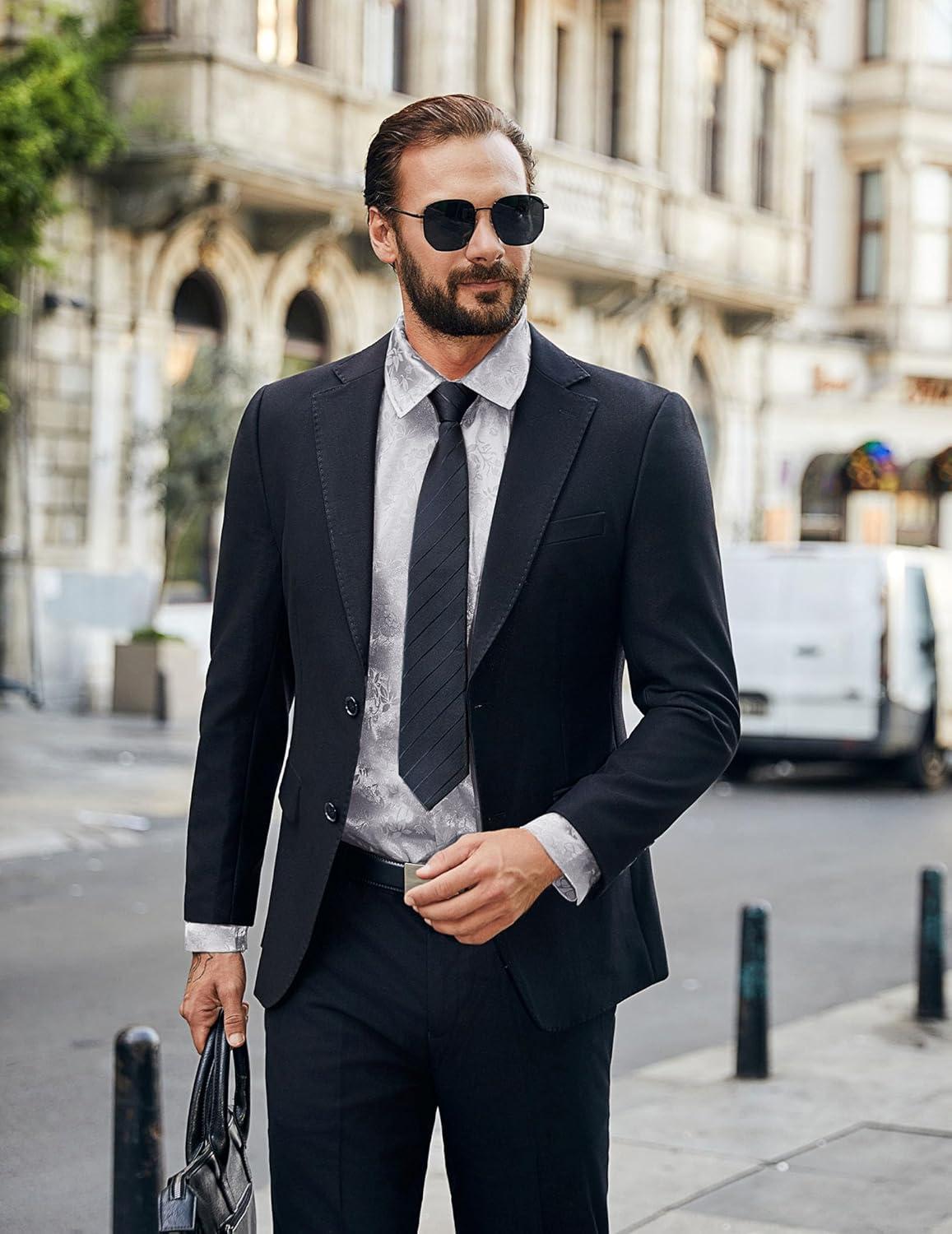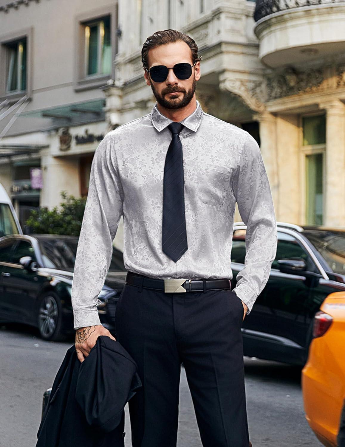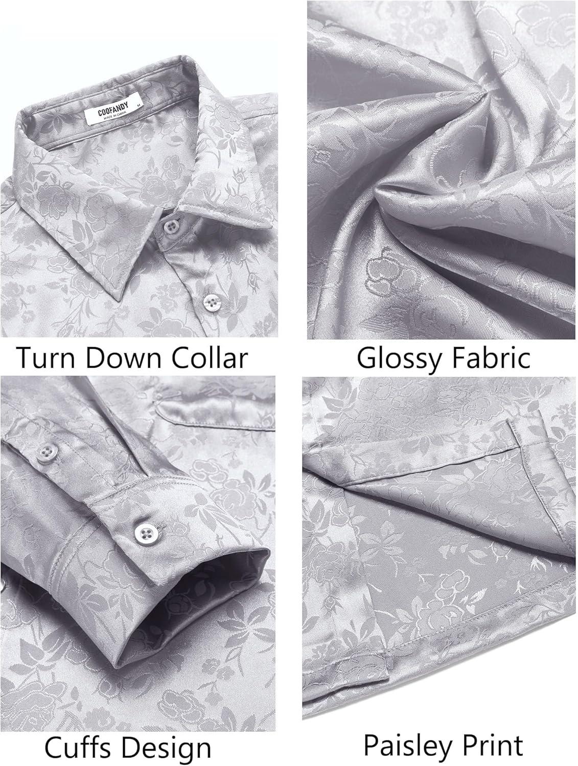 COOFANDY Mens Luxury Satin Dress Shirt Shiny Silk Long Sleeve Button Up Shirts Wedding Shirt Party Prom(Foral – Silver)