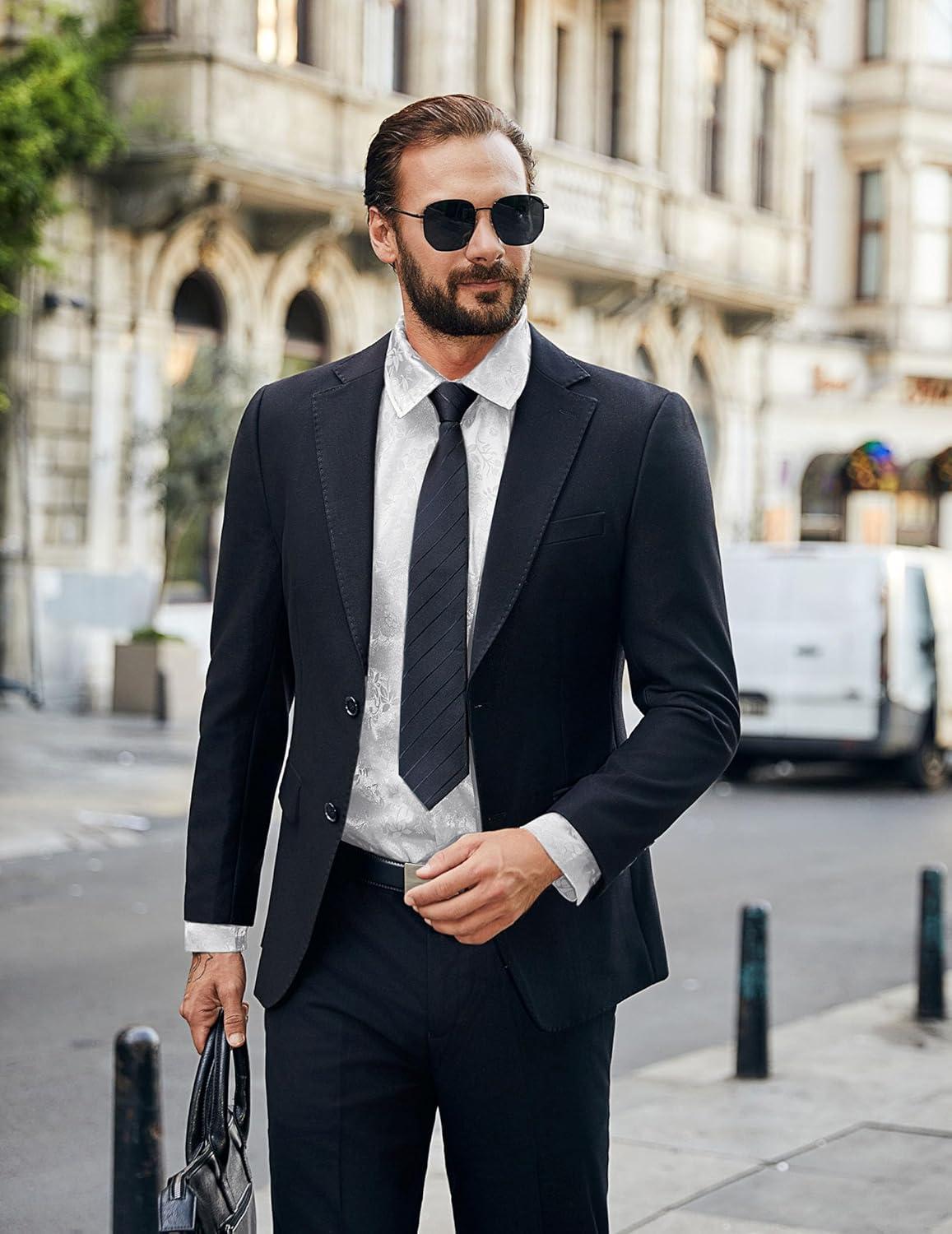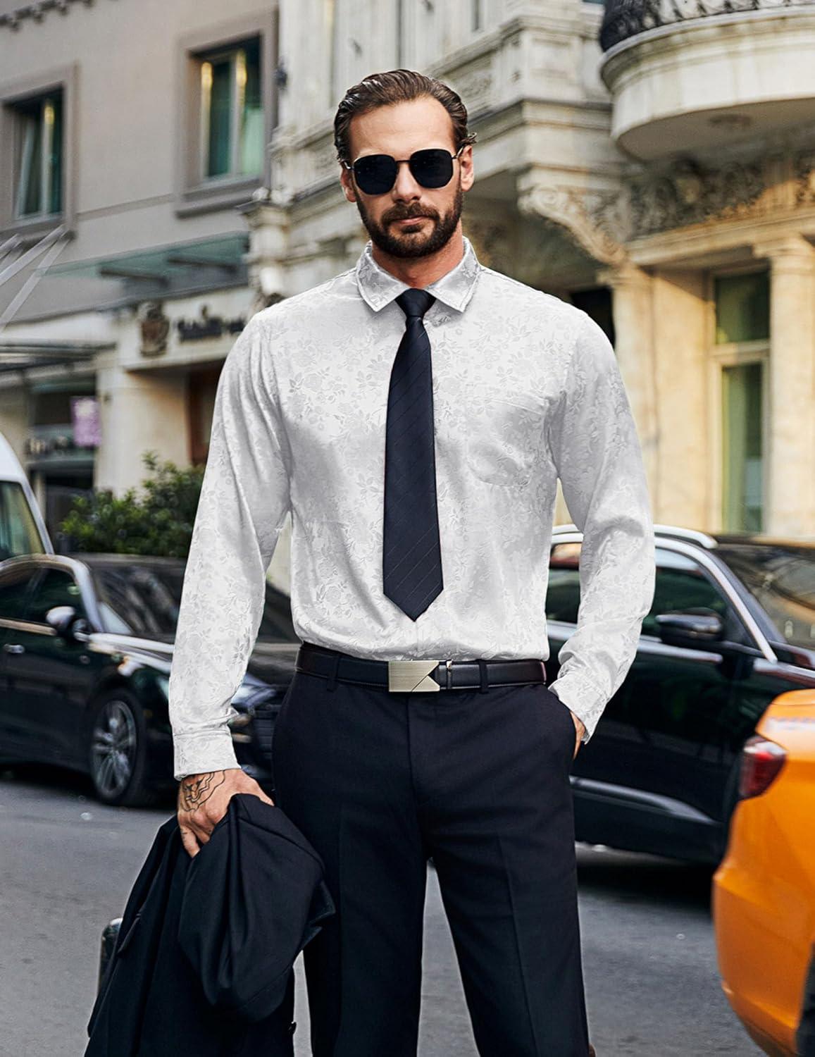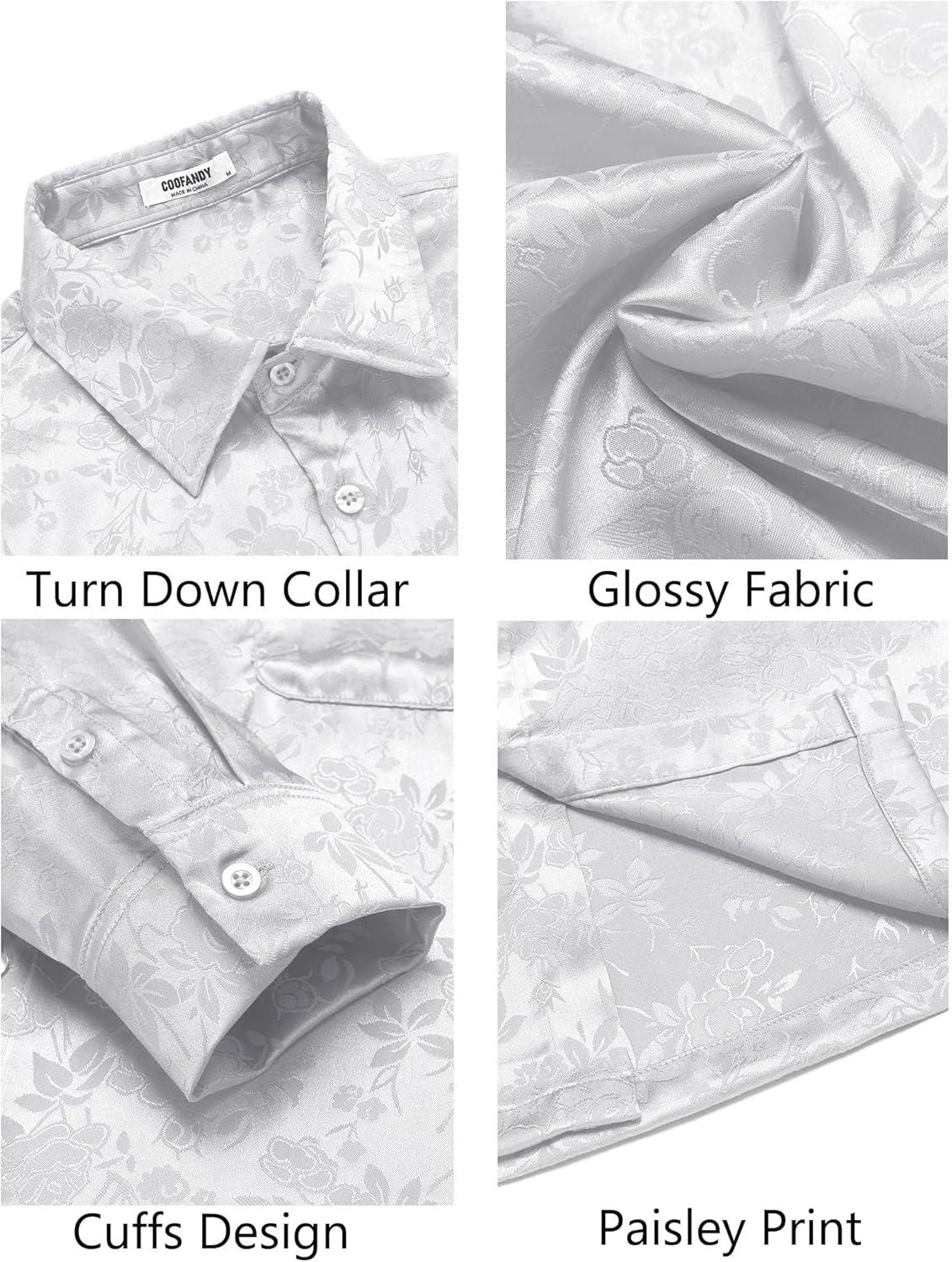 COOFANDY Mens Luxury Satin Dress Shirt Shiny Silk Long Sleeve Button Up Shirts Wedding Shirt Party Prom(Foral – White)