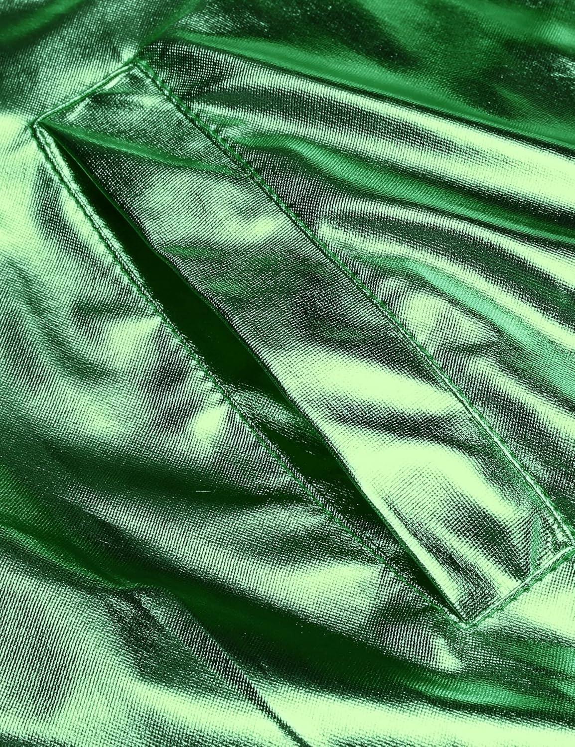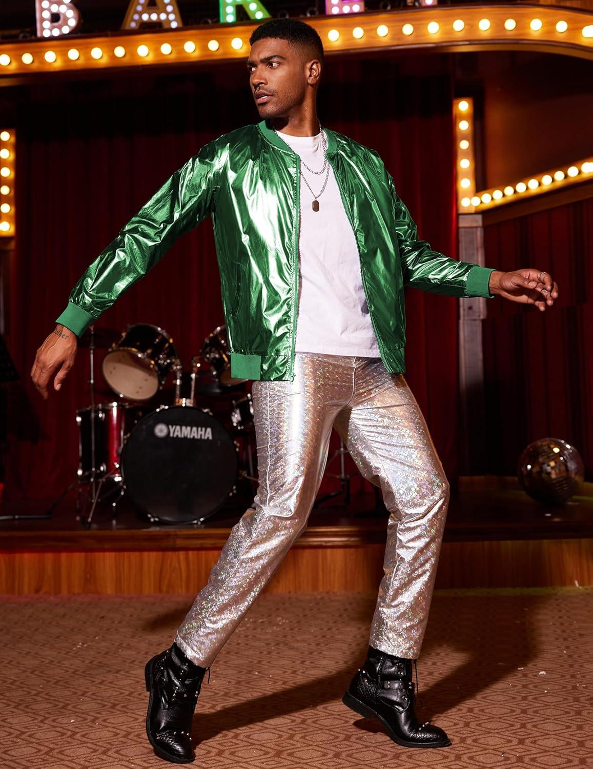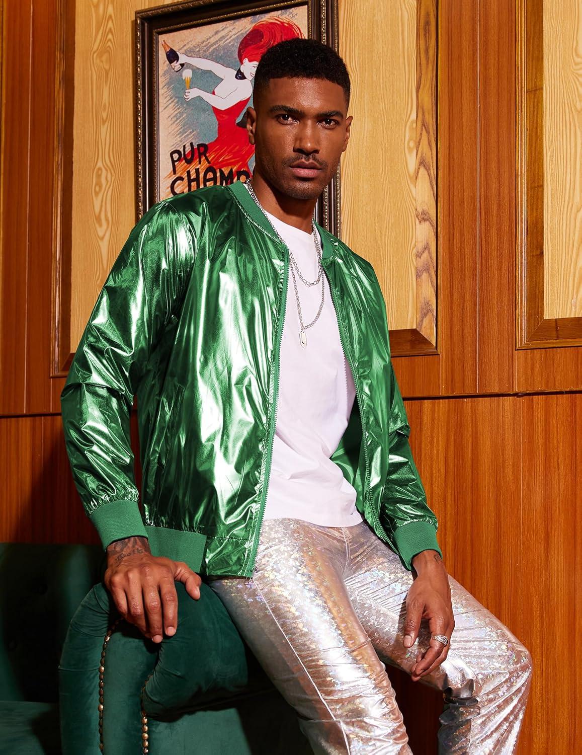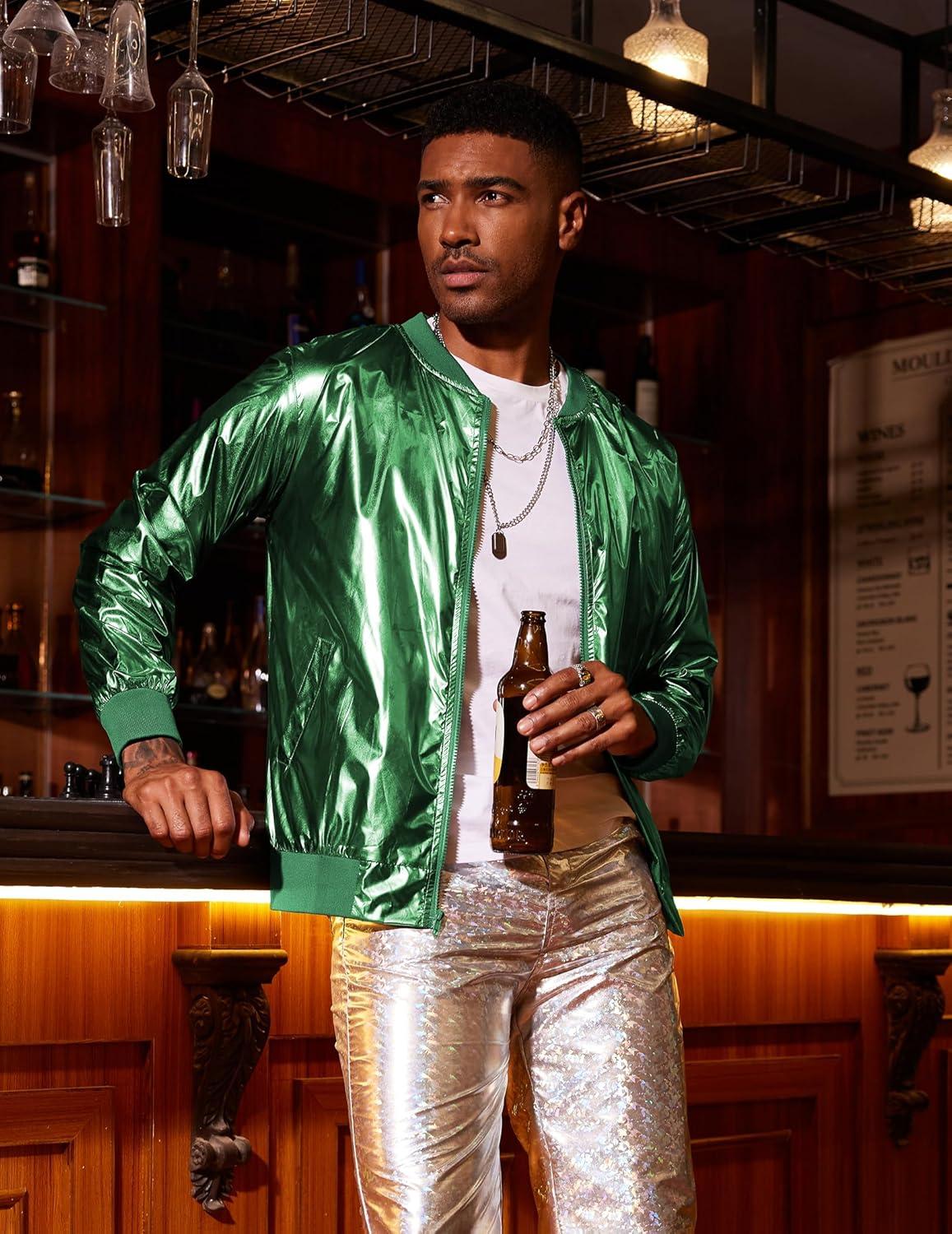 COOFANDY Men’s Metallic Jacket 70s Disco Dance Party Costume Shiny Varsity Zipper Baseball Bomber Jacket(Green)