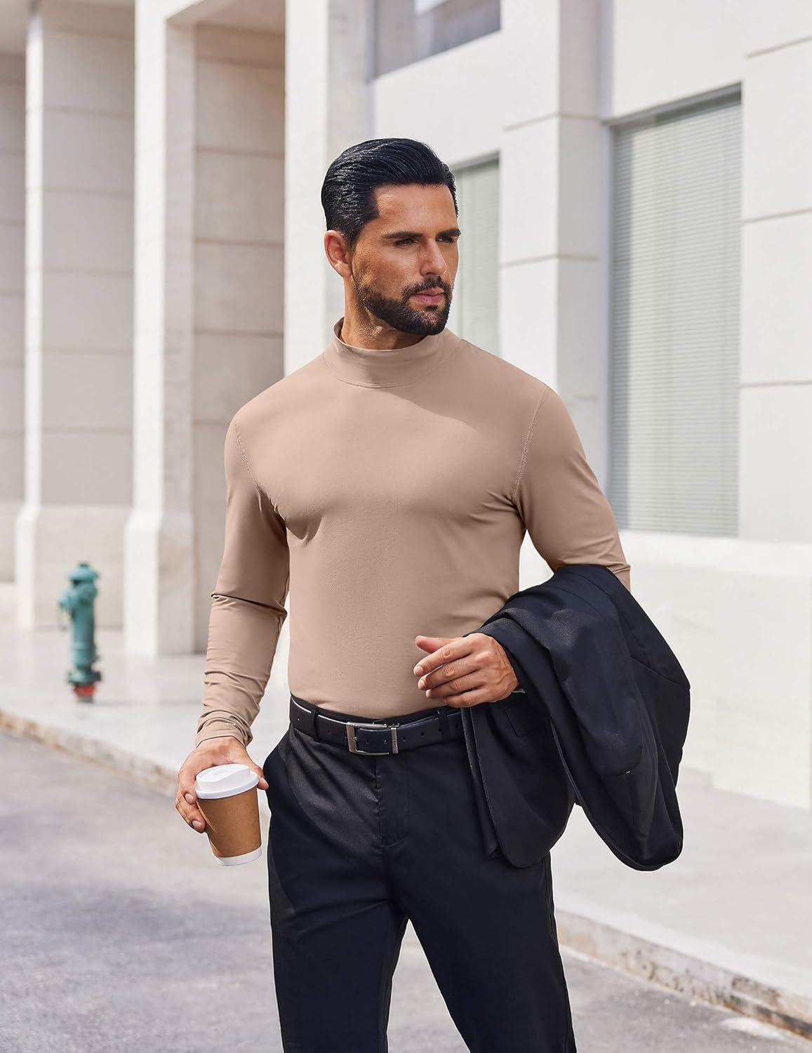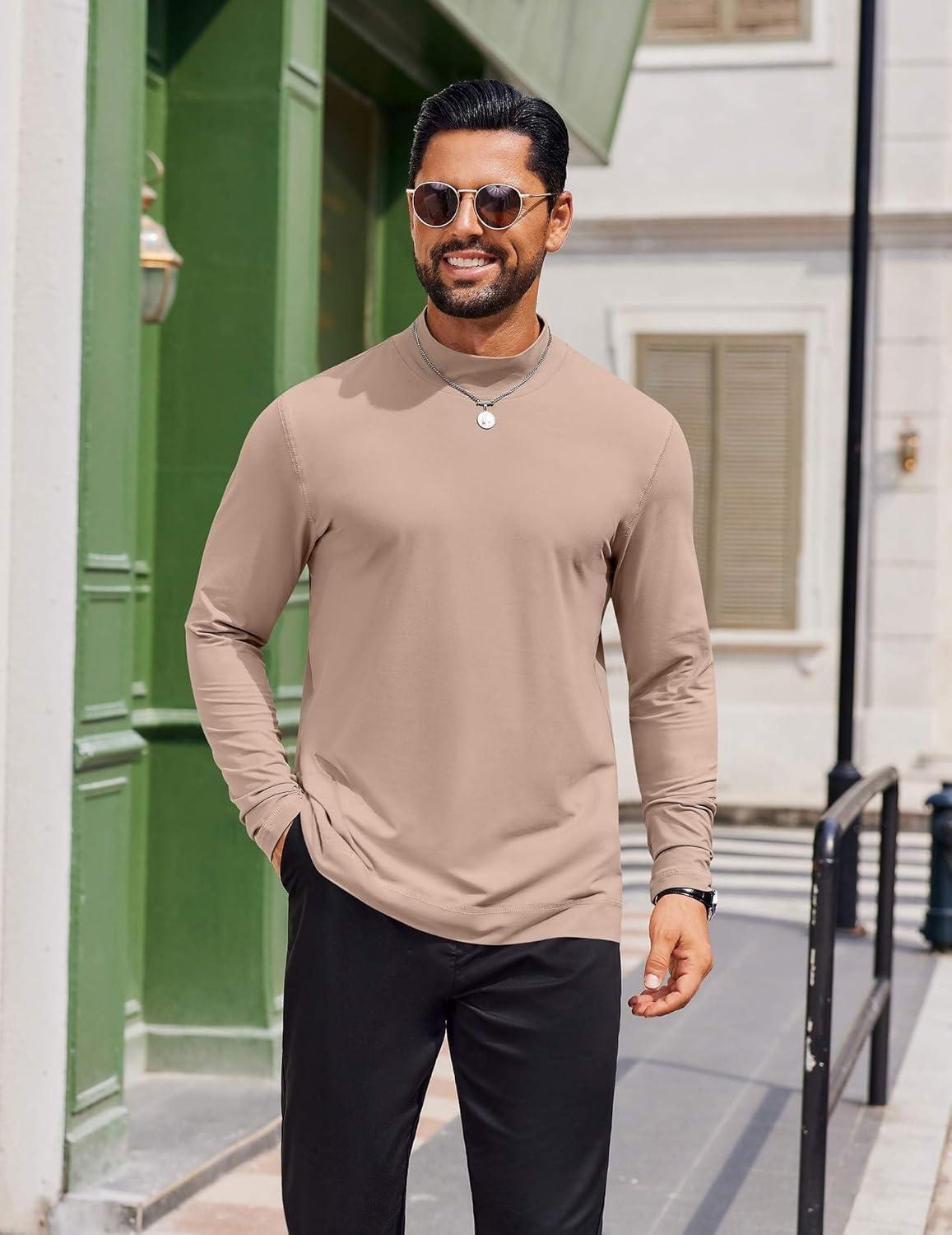 COOFANDY Mens Mock Turtleneck Long Sleeve Shirts Casual Basic T-Shirt Lightweight Mockneck Pullover Sweater for Men(Light Brown)