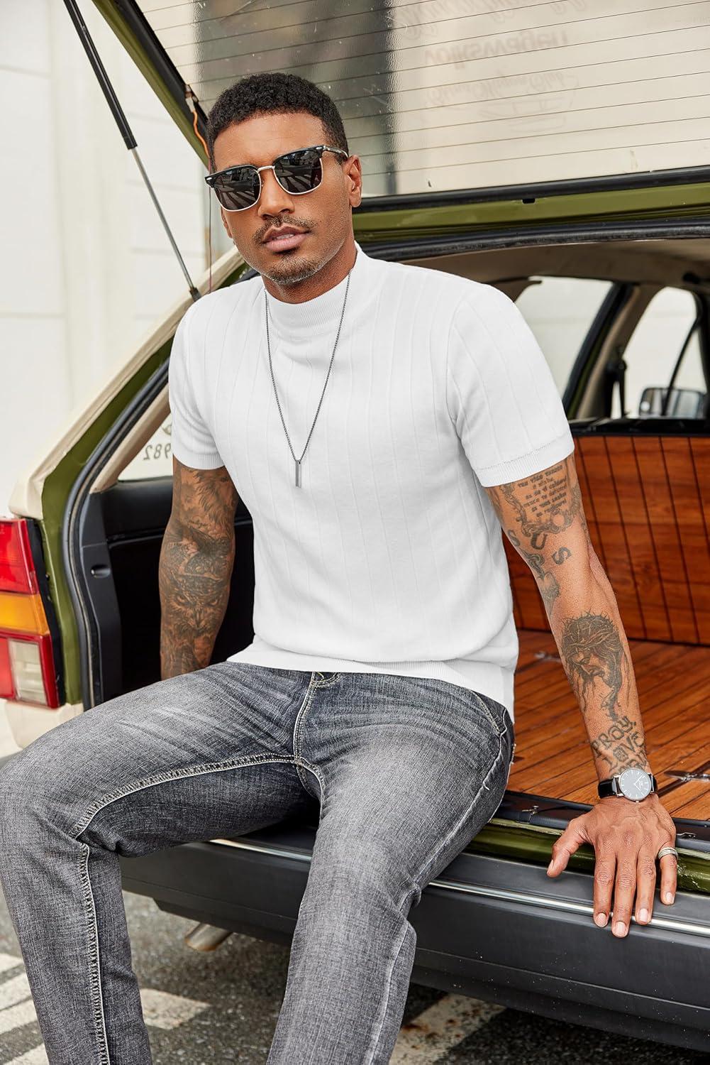 COOFANDY Men’s Mock Turtleneck Sweater Short Sleeve Casual Basic Tops Ribbed Knit Pullover Solid Tee(Pat2 Striped White)
