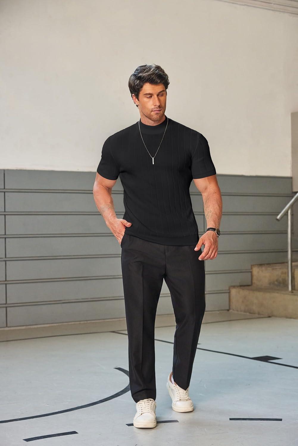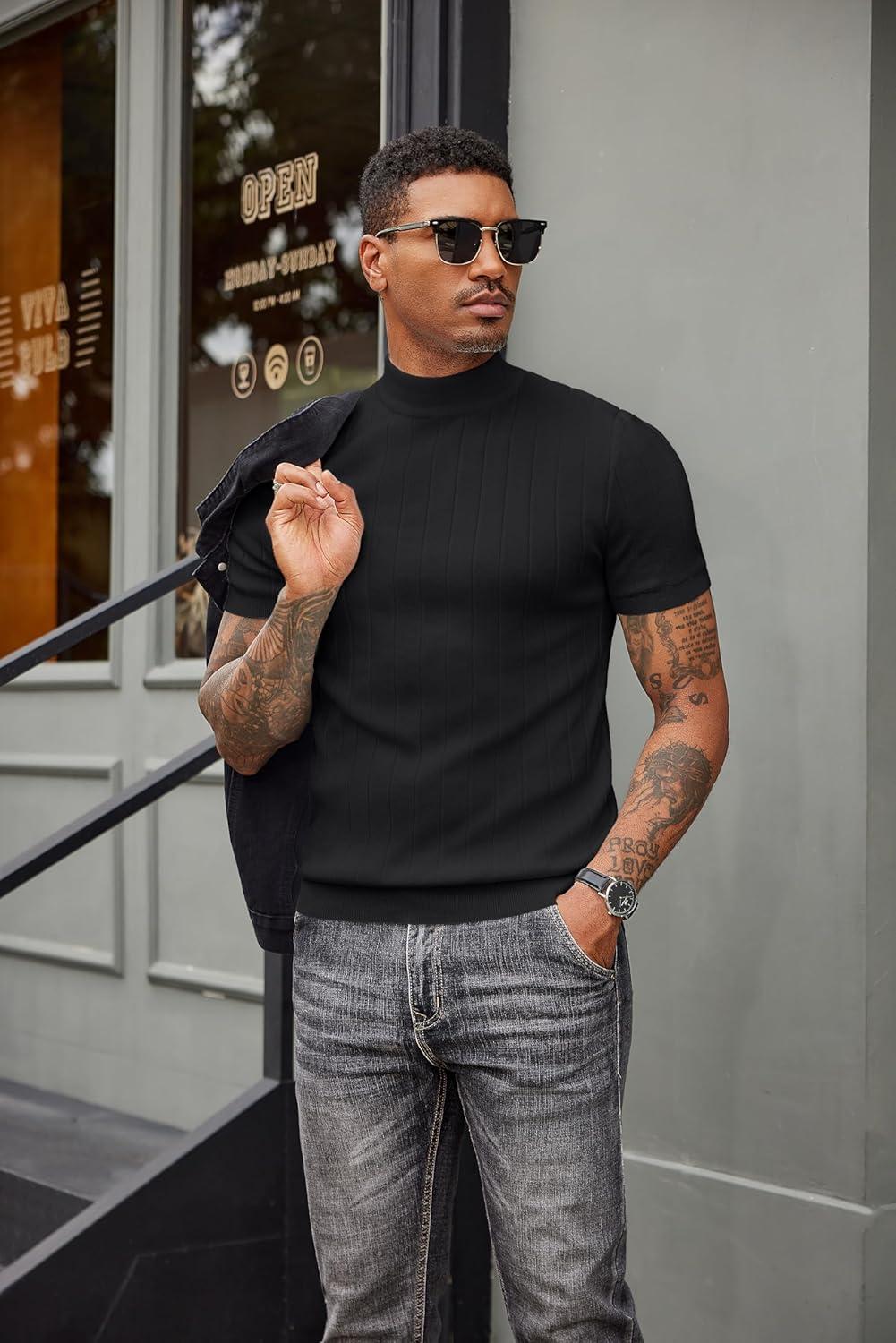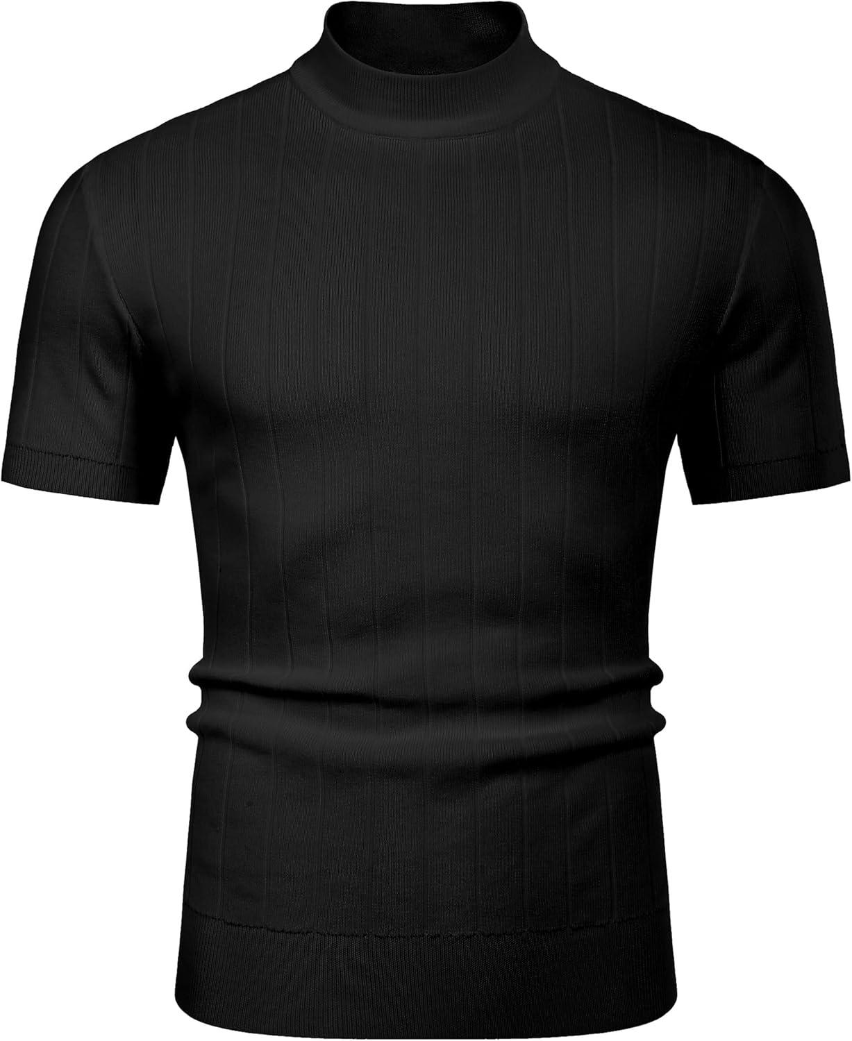 COOFANDY Men’s Mock Turtleneck Sweater Short Sleeve Casual Basic Tops Ribbed Knit Pullover Solid Tee(Pat3 Striped Black)