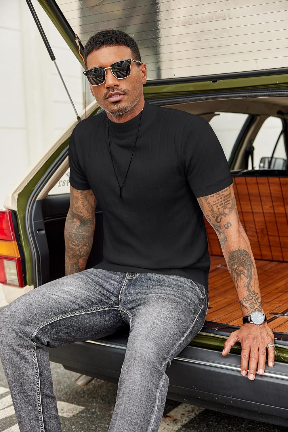 Be the first to review “COOFANDY Men’s Mock Turtleneck Sweater Short Sleeve Casual Basic Tops Ribbed Knit Pullover Solid Tee(Pat3 Striped Black)”