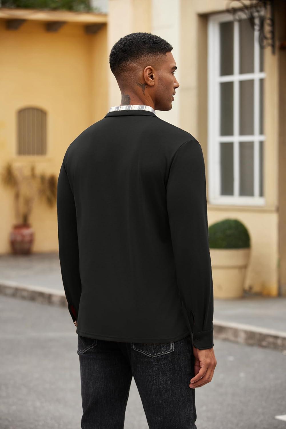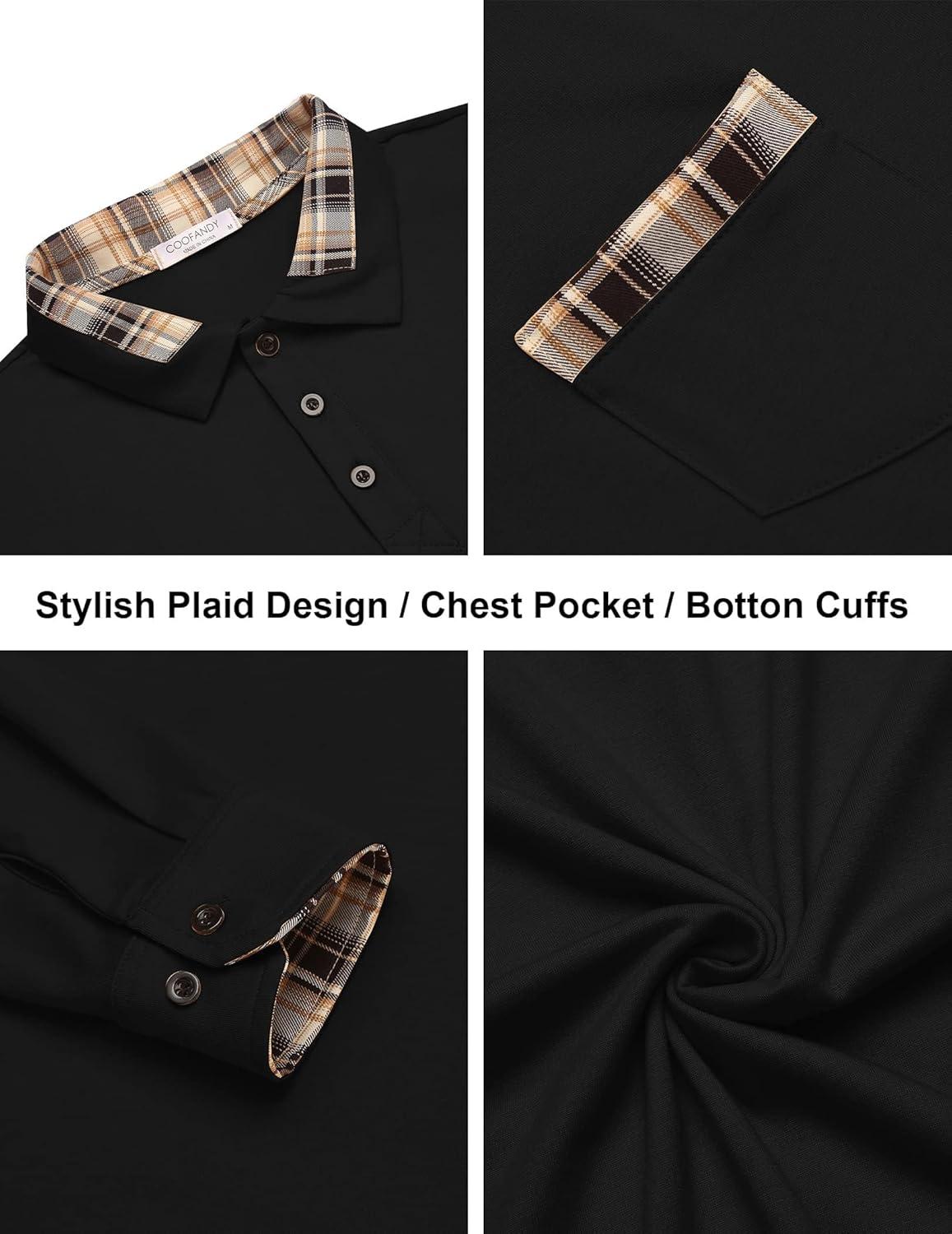 COOFANDY Men’s Polo Shirt Long Sleeve Casual Button Polo Tee Plaid Collared Golg Shirt with Pocket(A-black)