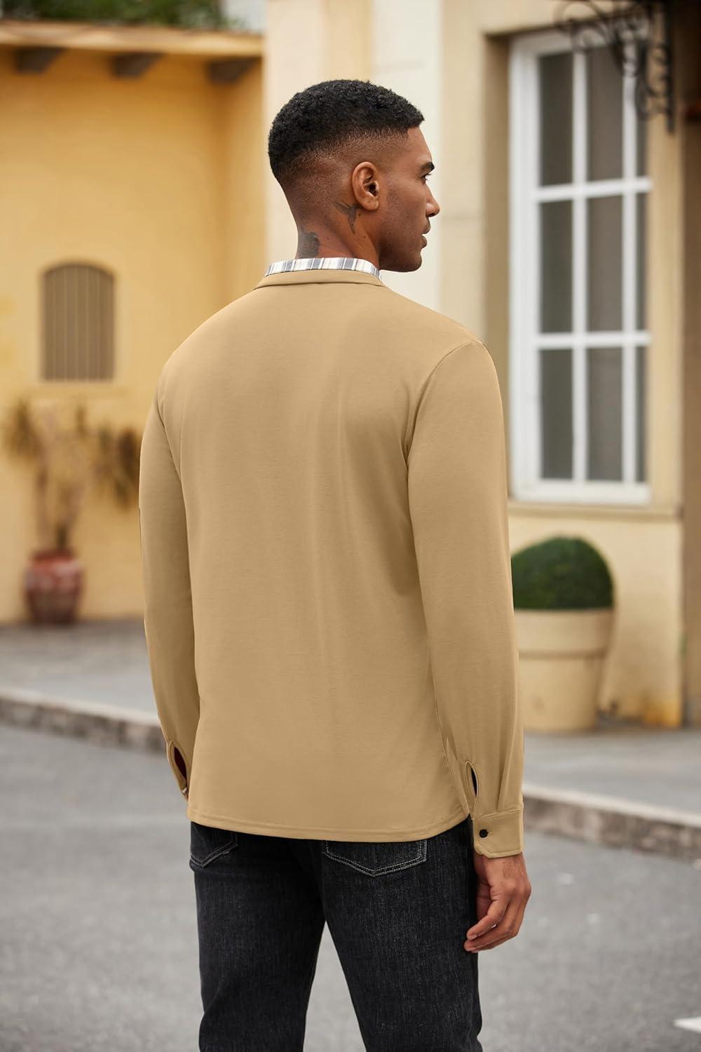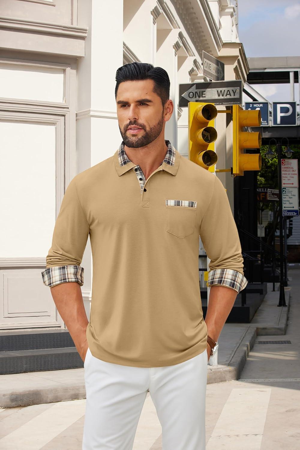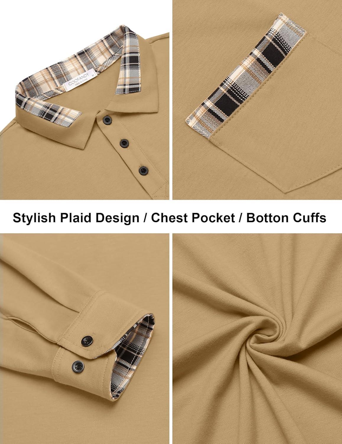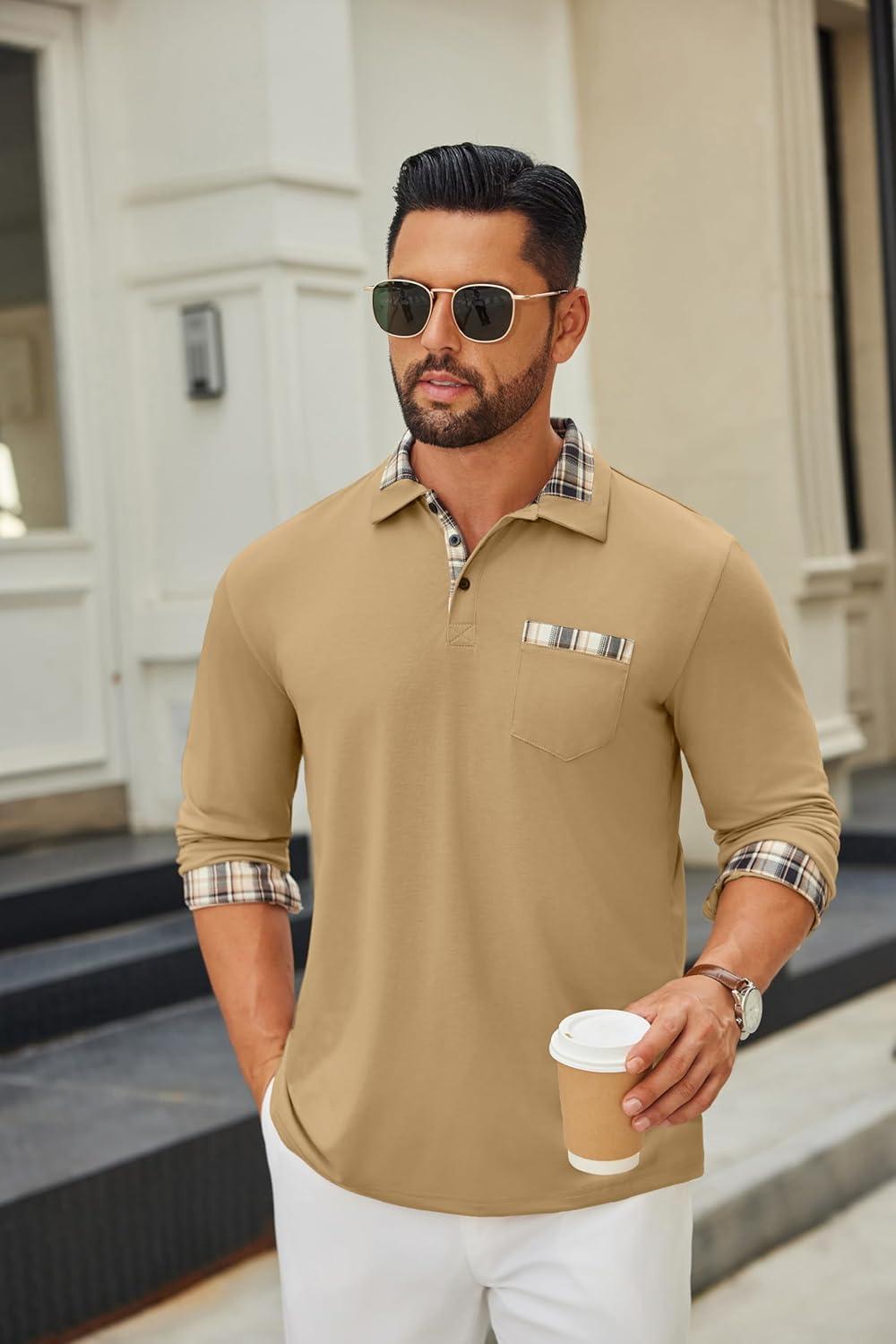 COOFANDY Men’s Polo Shirt Long Sleeve Casual Button Polo Tee Plaid Collared Golg Shirt with Pocket(Camel)