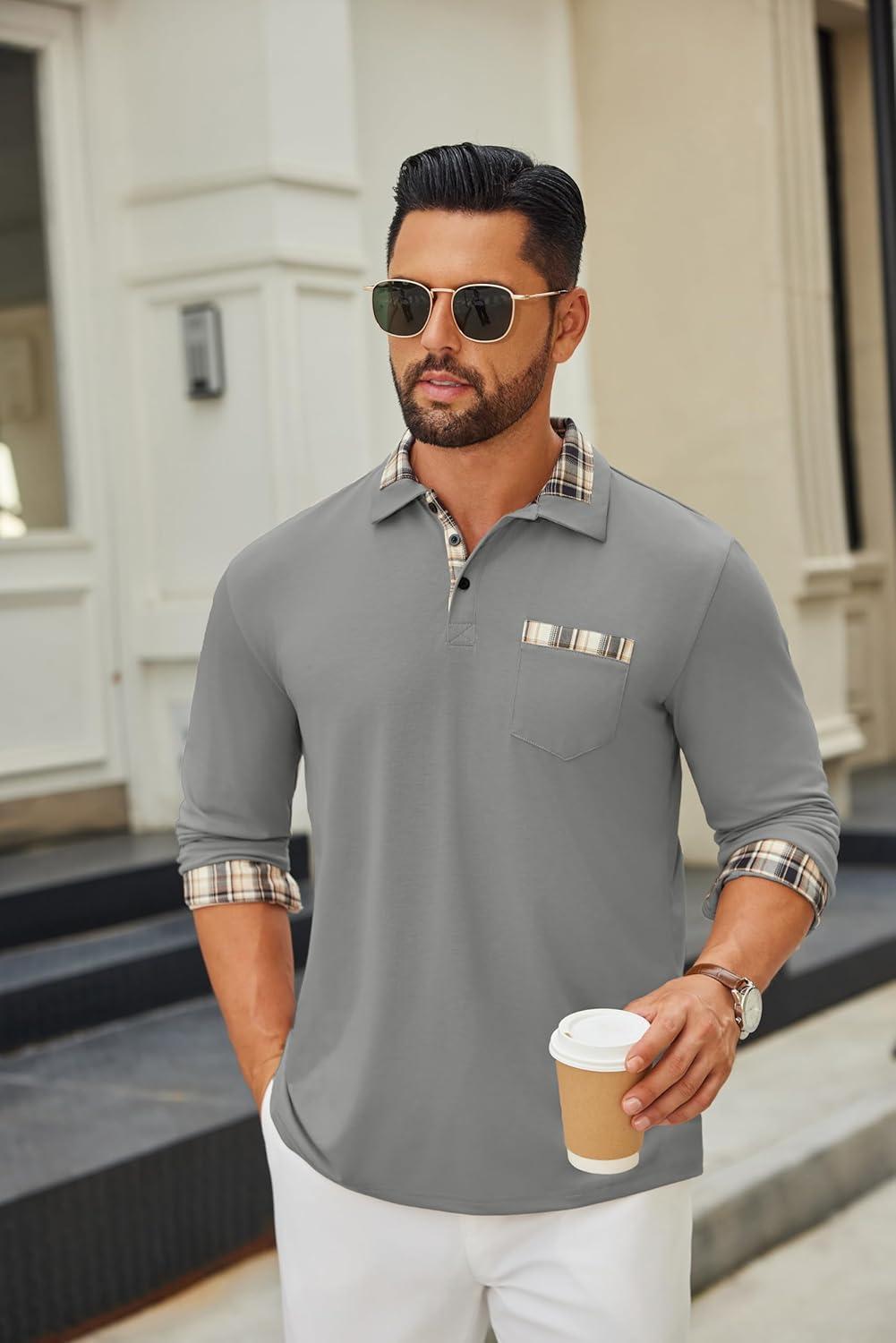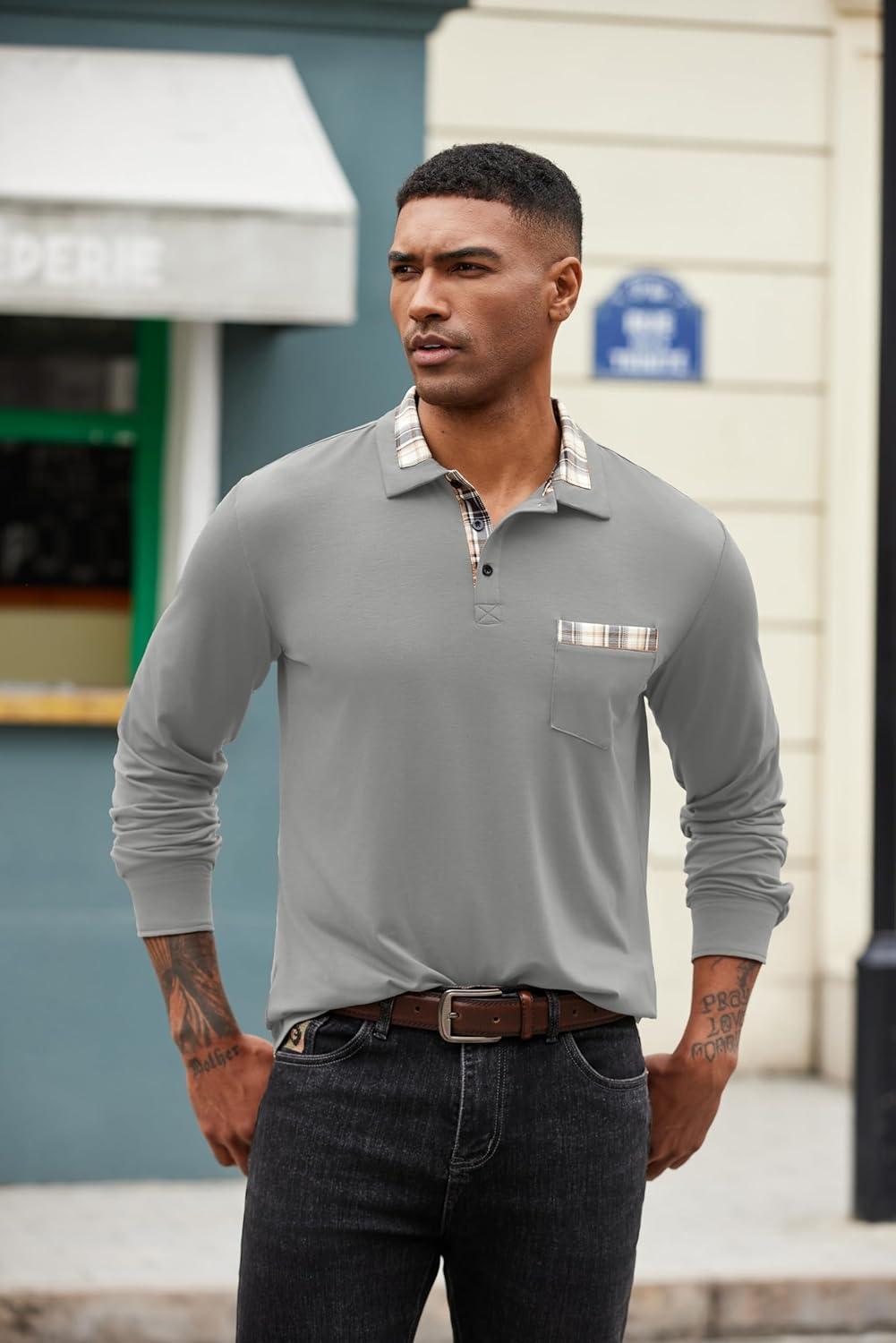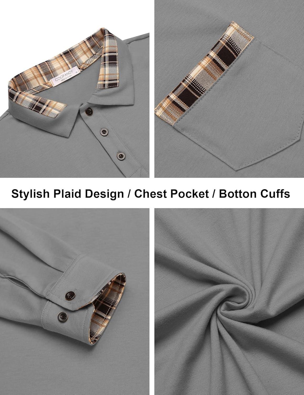 COOFANDY Men’s Polo Shirt Long Sleeve Casual Button Polo Tee Plaid Collared Golg Shirt with Pocket(Grey)