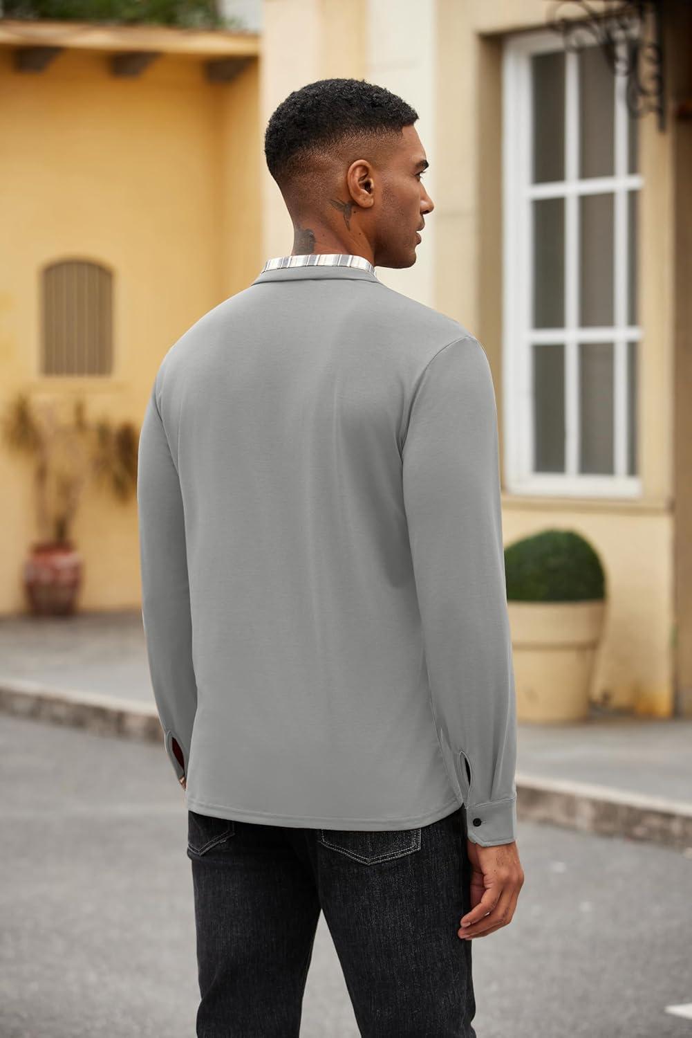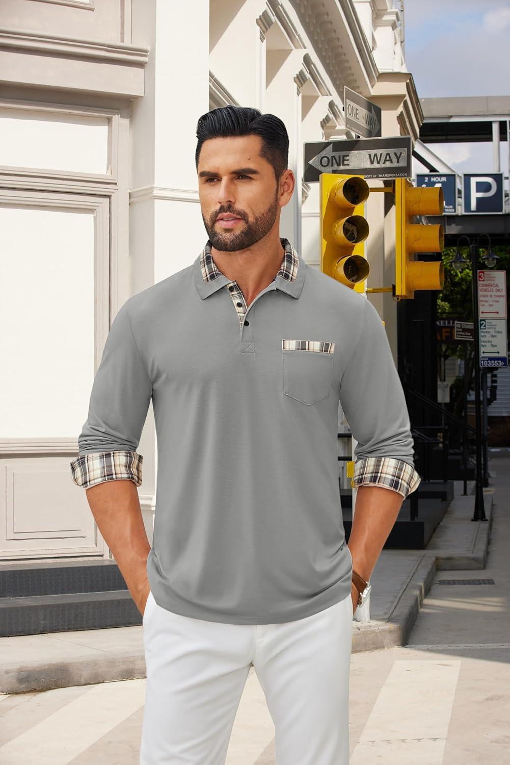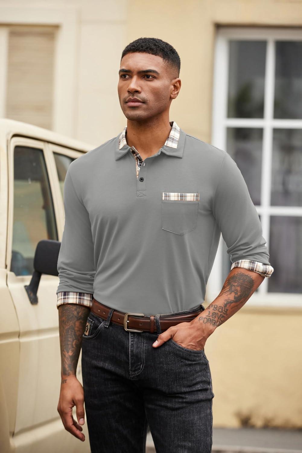 COOFANDY Men’s Polo Shirt Long Sleeve Casual Button Polo Tee Plaid Collared Golg Shirt with Pocket(Grey)