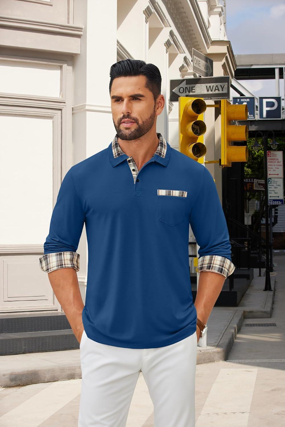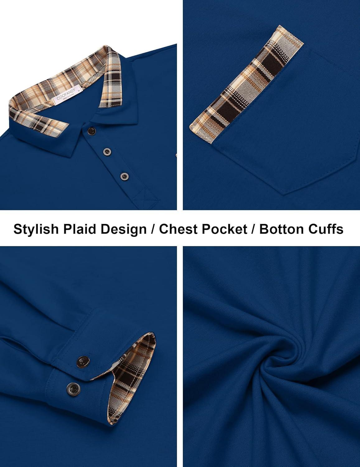 COOFANDY Men’s Polo Shirt Long Sleeve Casual Button Polo Tee Plaid Collared Golg Shirt with Pocket(Royal Blue)