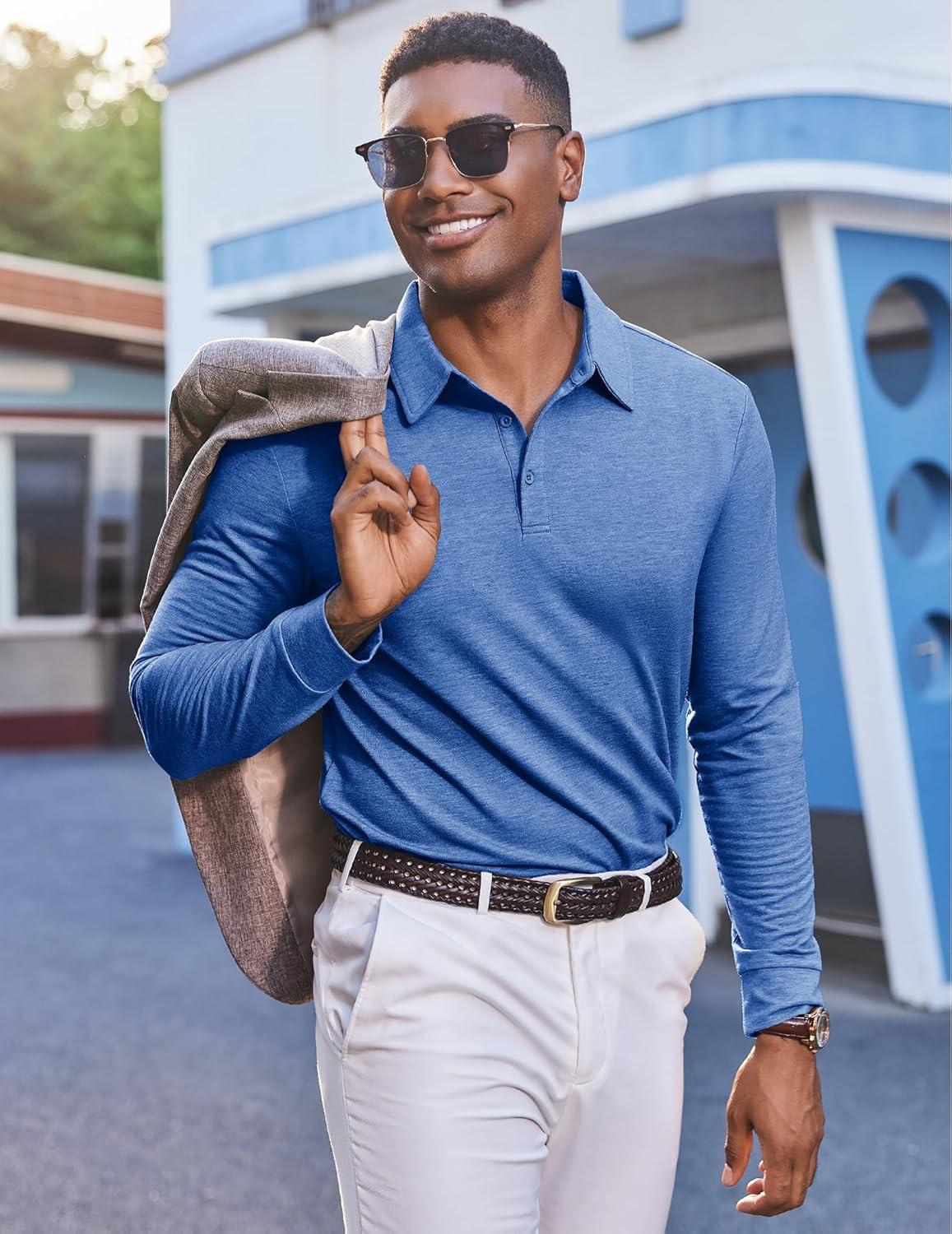 COOFANDY Mens Polo Sweatshirts Long Sleeve Casual Lightweigt Polo Shirts Button Down Golf Shirt(Blue)