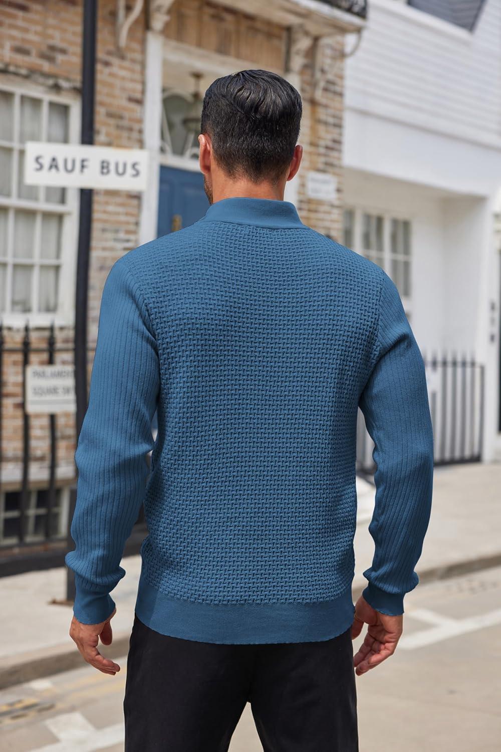 COOFANDY Men’s Quarter Button Sweater Lightweight Mock Neck Pullover Sweater Fashion Casual Knitted Waffle Henley Sweater(Dark Blue)