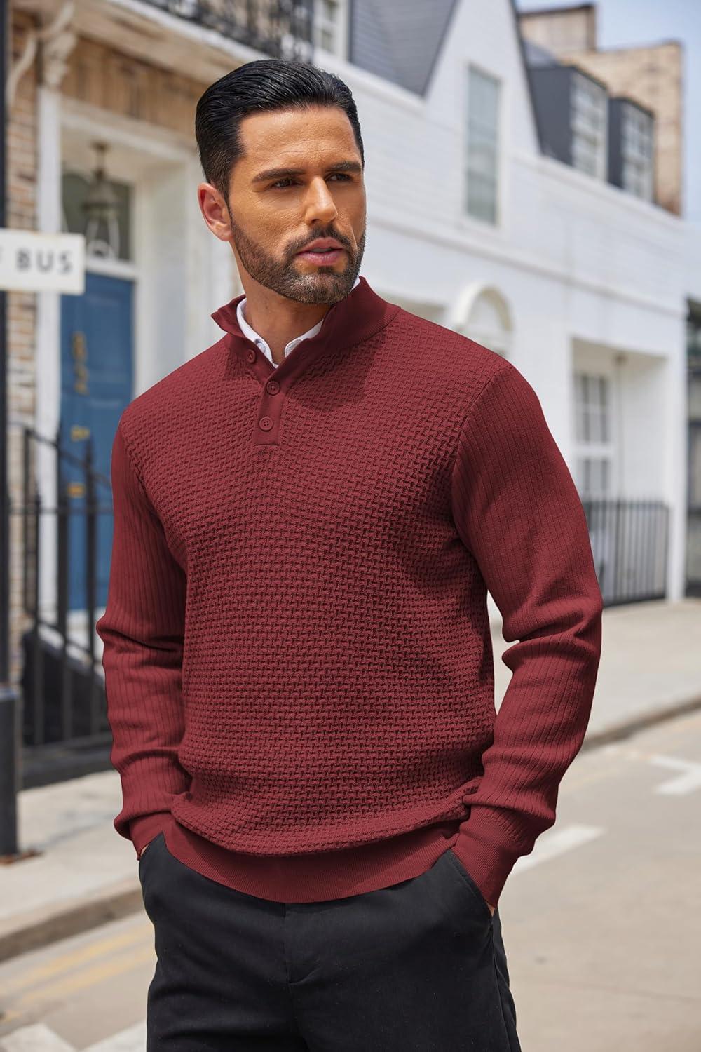 COOFANDY Men’s Quarter Button Sweater Lightweight Mock Neck Pullover Sweater Fashion Casual Knitted Waffle Henley Sweater(Wine Red)