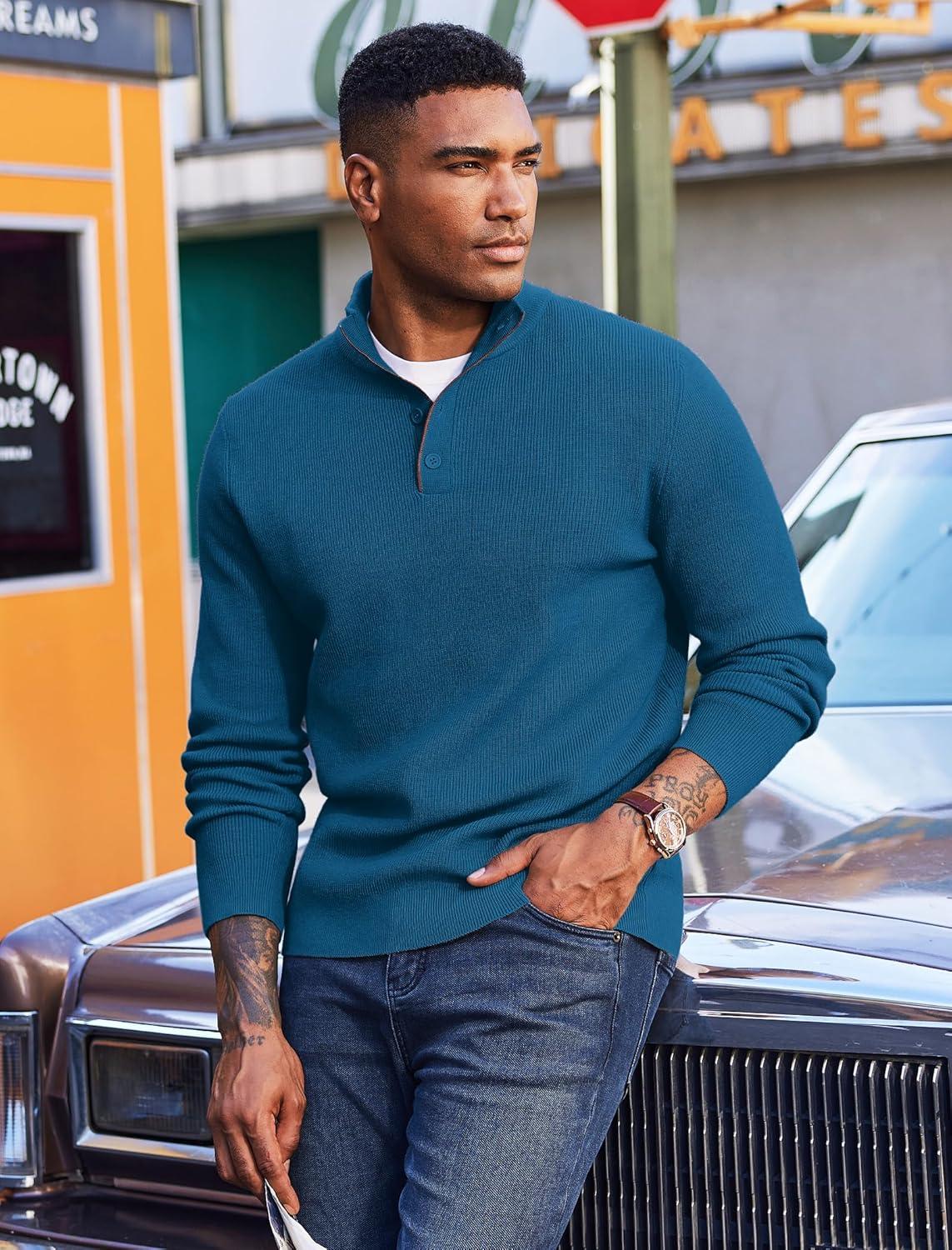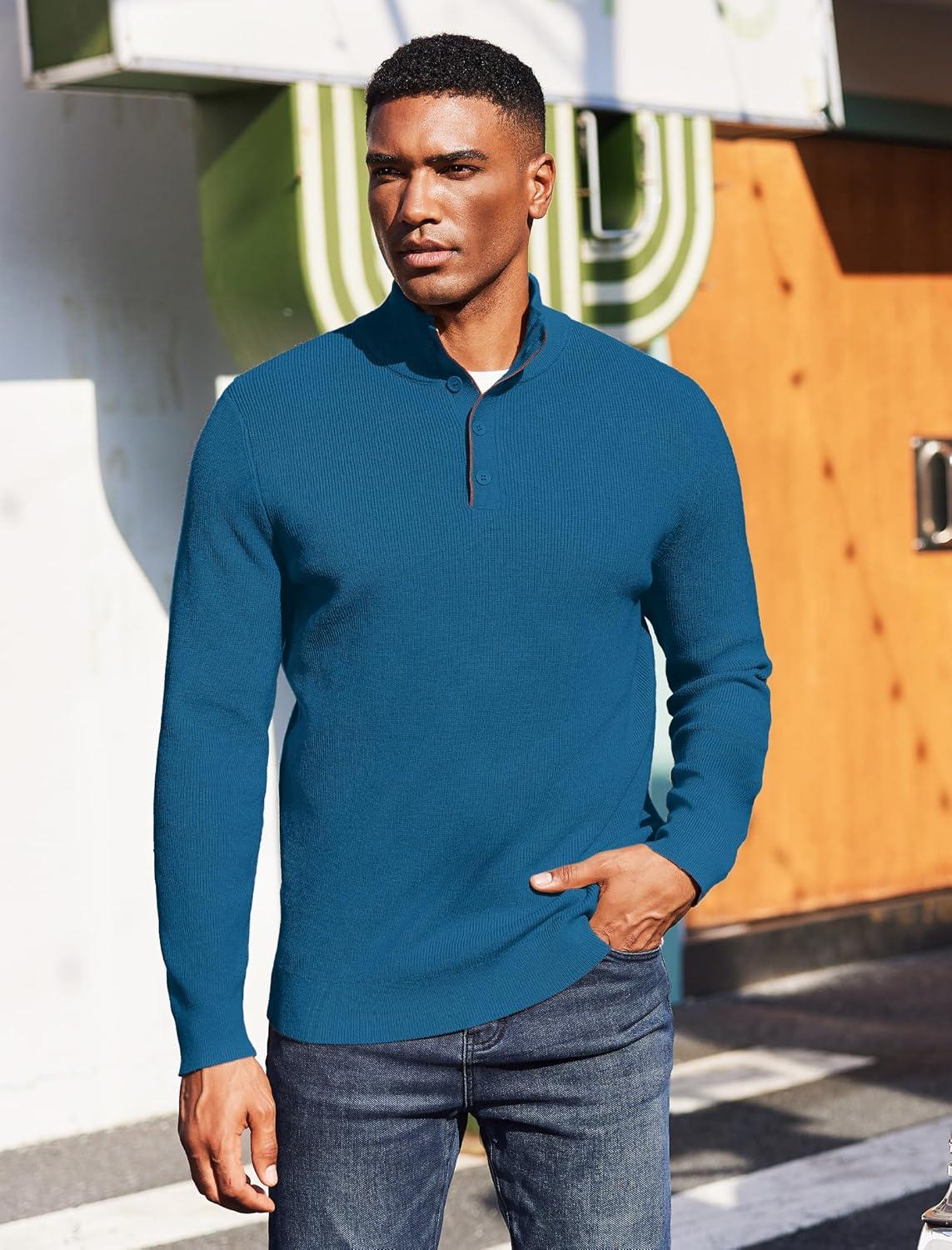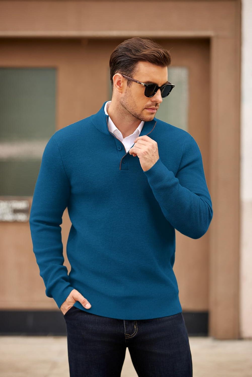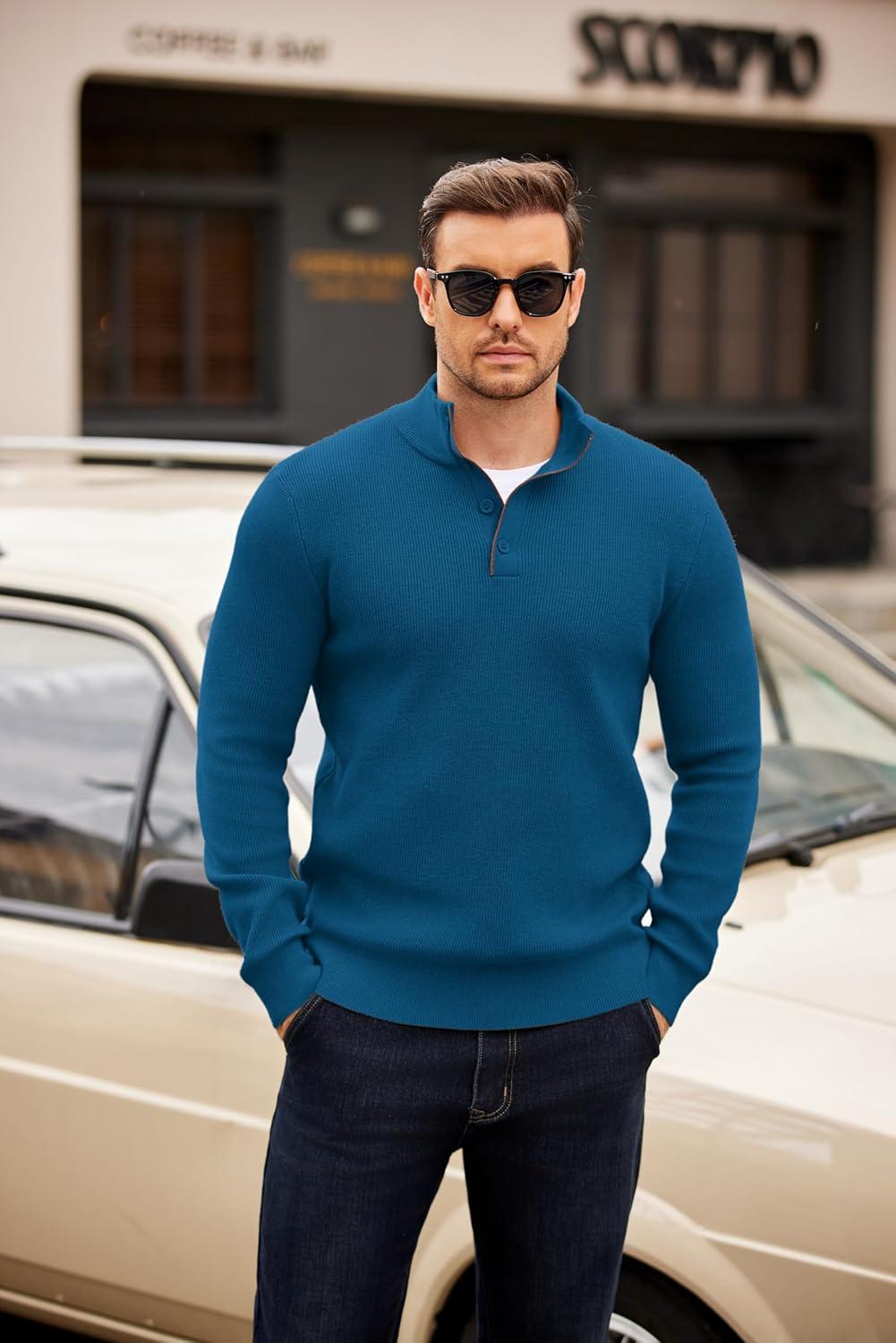 COOFANDY Men’s Quarter Button Sweater Mock Neck Textured Knitted Pullover(Dark Blue)