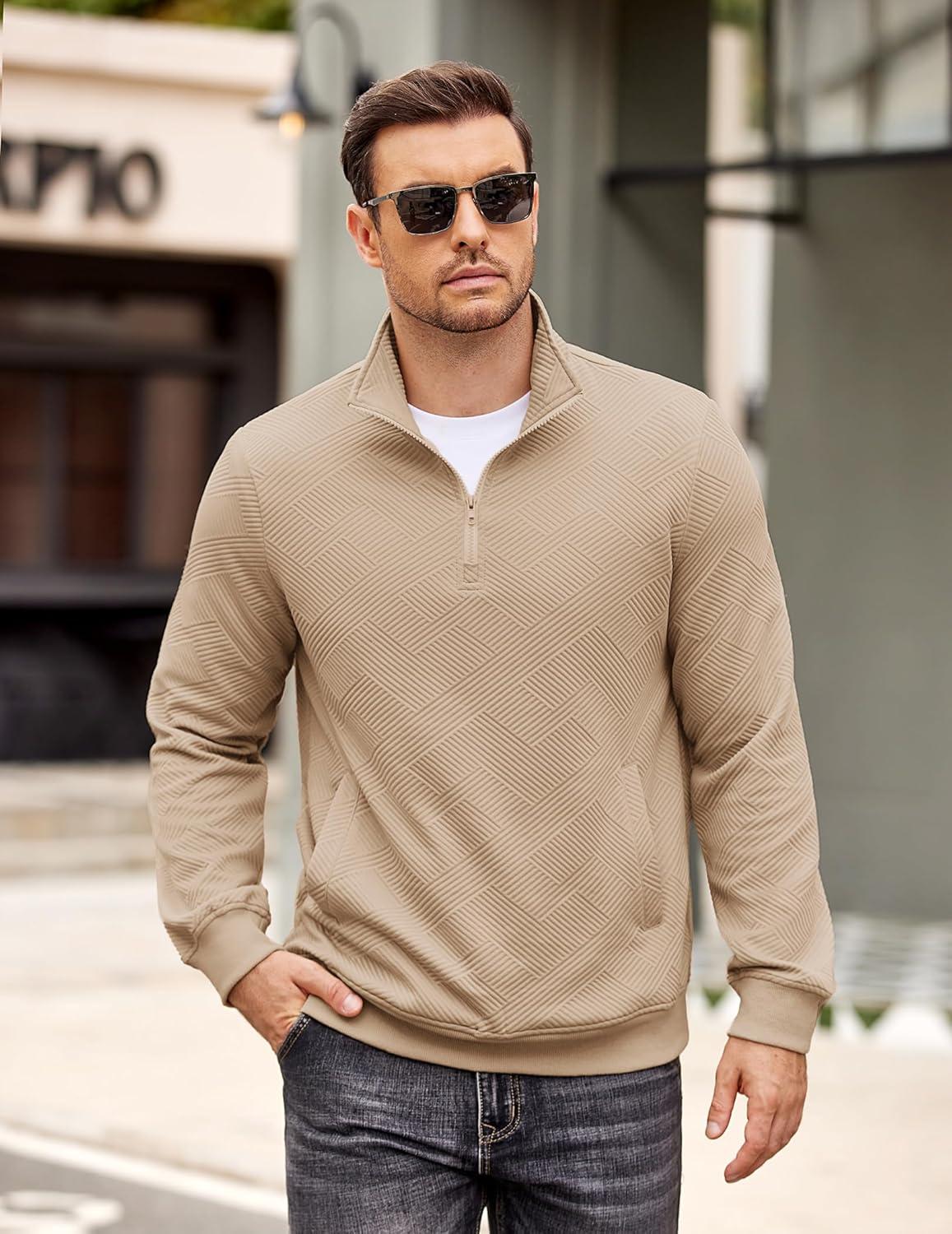 COOFANDY Mens Quarter Zip Pullover Casual Long Sleeve Quilted Sweatshirt Mock Neck Polo Sweater with Pocket(Khaki)