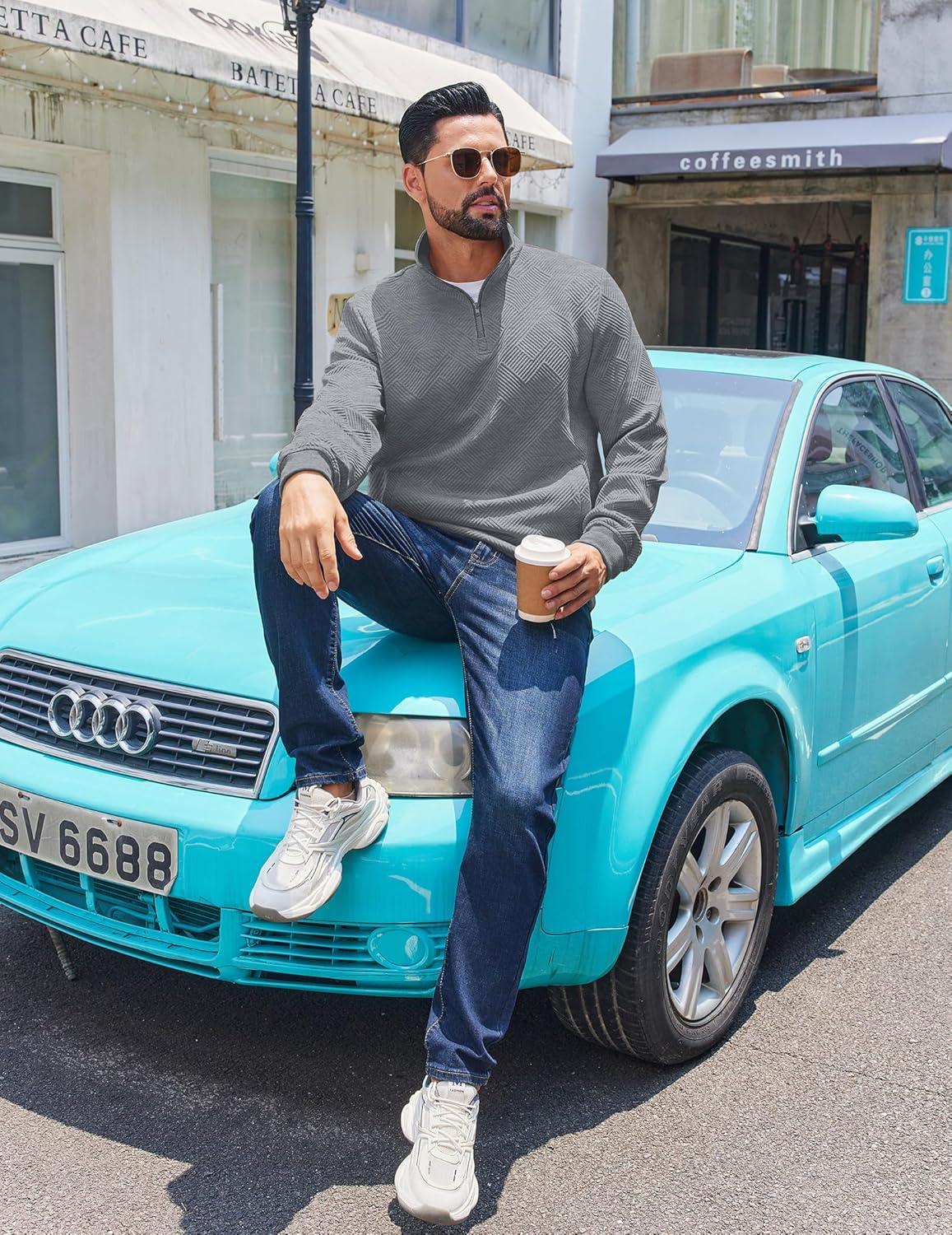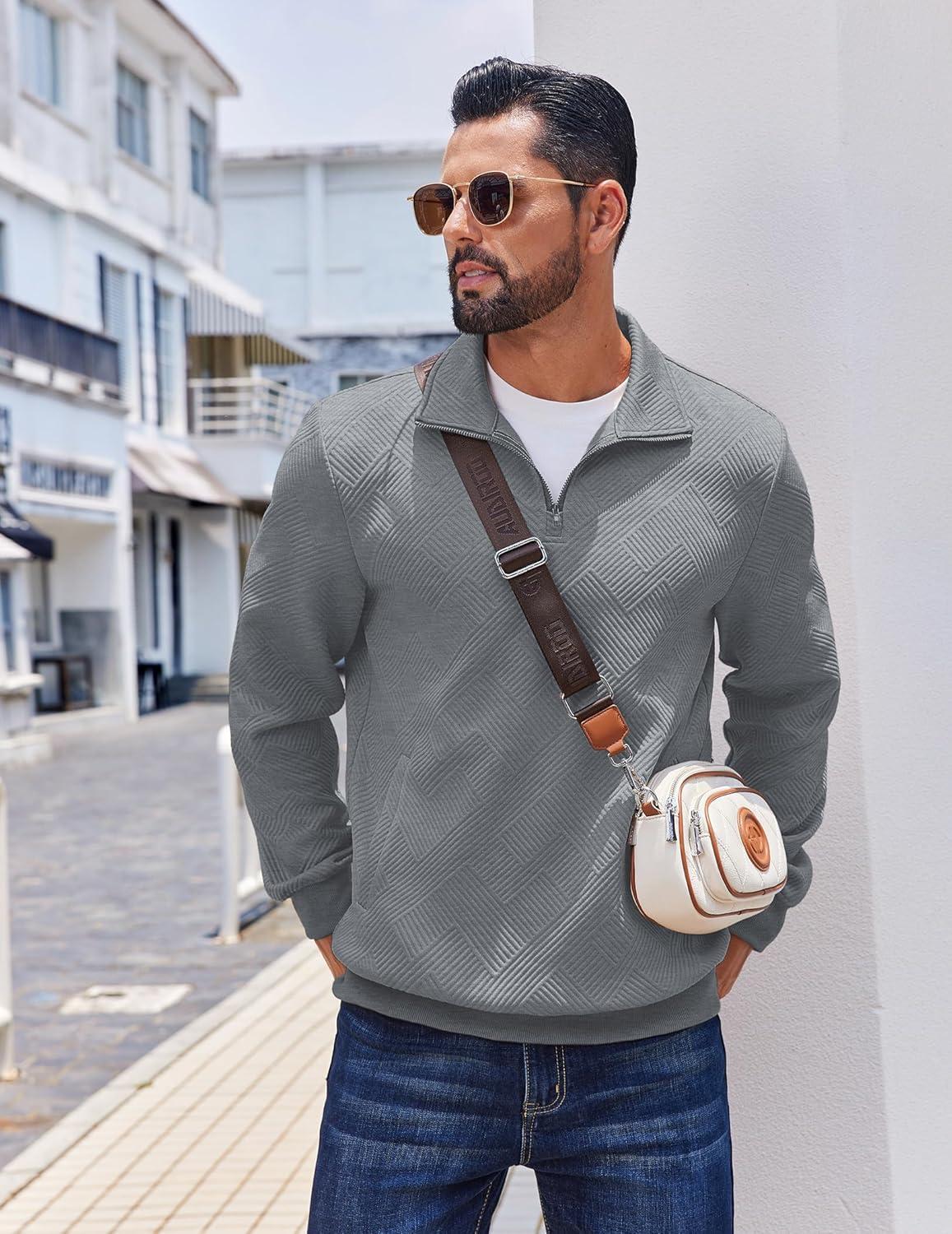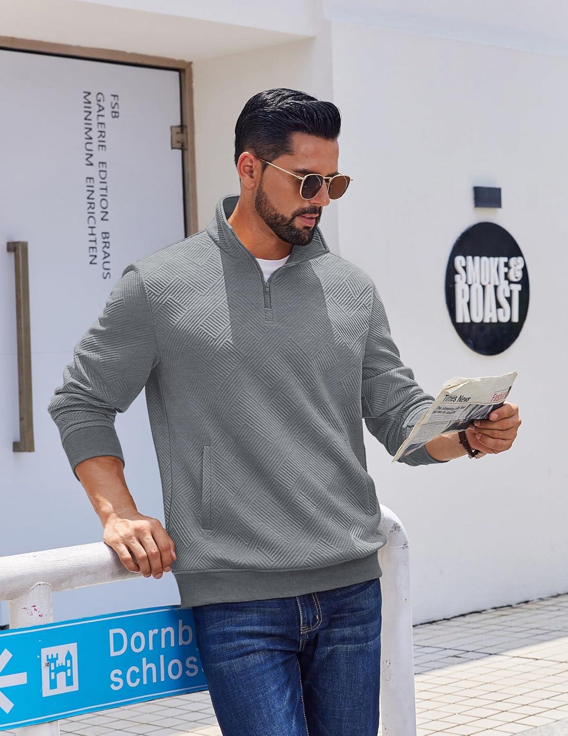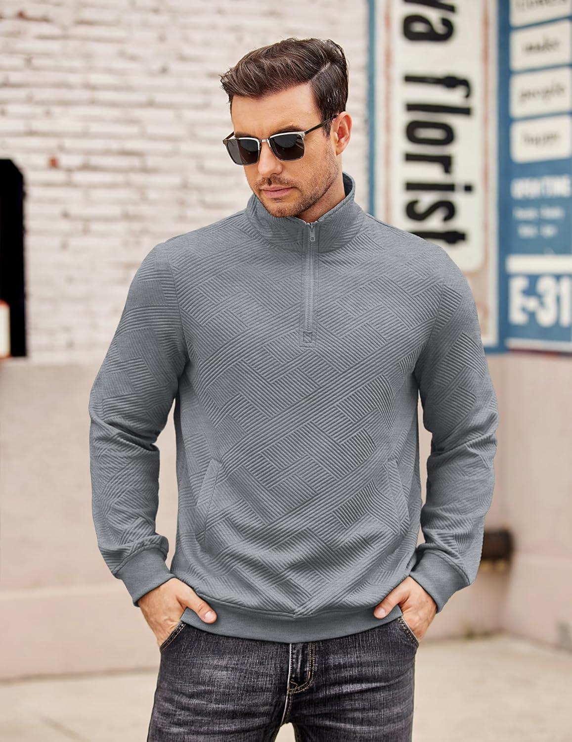 COOFANDY Mens Quarter Zip Pullover Casual Long Sleeve Quilted Sweatshirt Mock Neck Polo Sweater with Pocket(Light Grey)