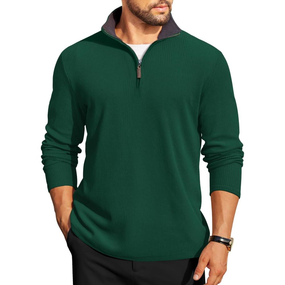 COOFANDY Mens Quarter Zip Pullover Lightweight Sweater Casual Long Sleeve Corduroy Half Zip Sweatshirt(Ever Green)