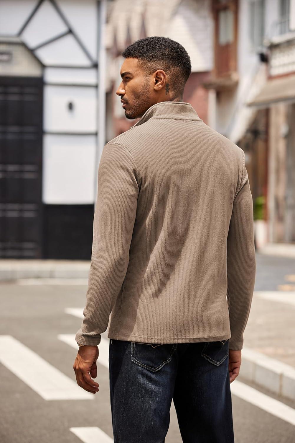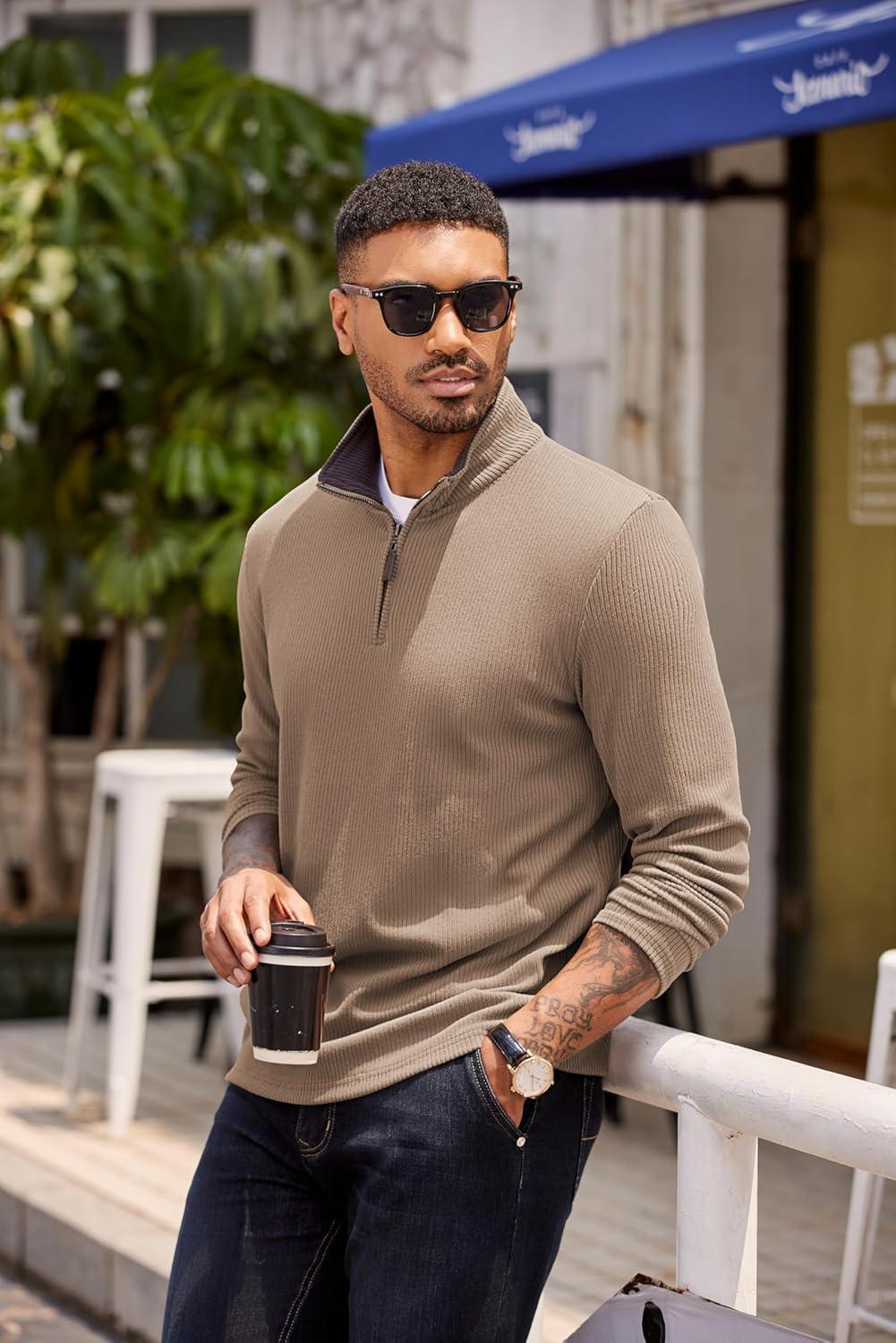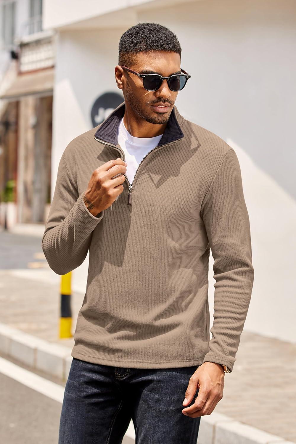 COOFANDY Mens Quarter Zip Pullover Lightweight Sweater Casual Long Sleeve Corduroy Half Zip Sweatshirt(Khaki)