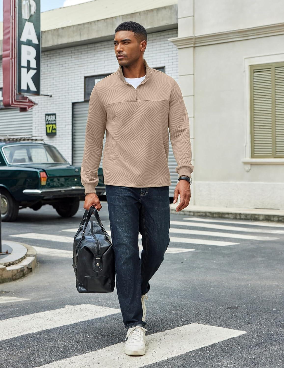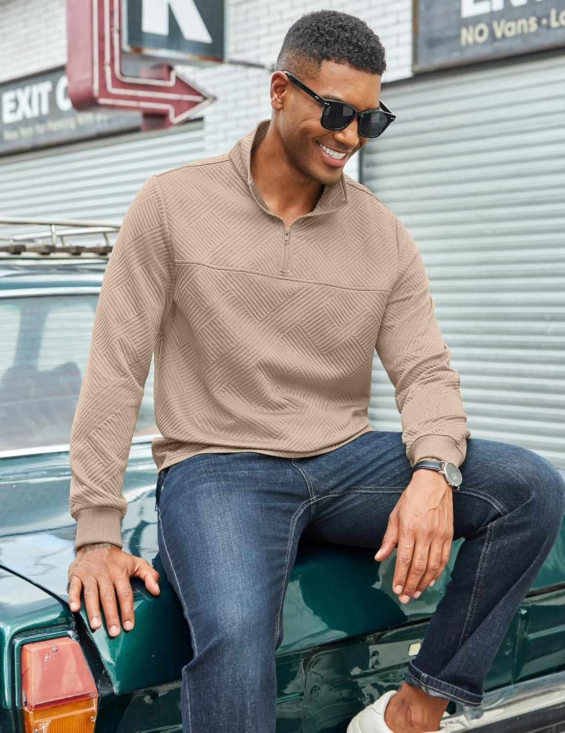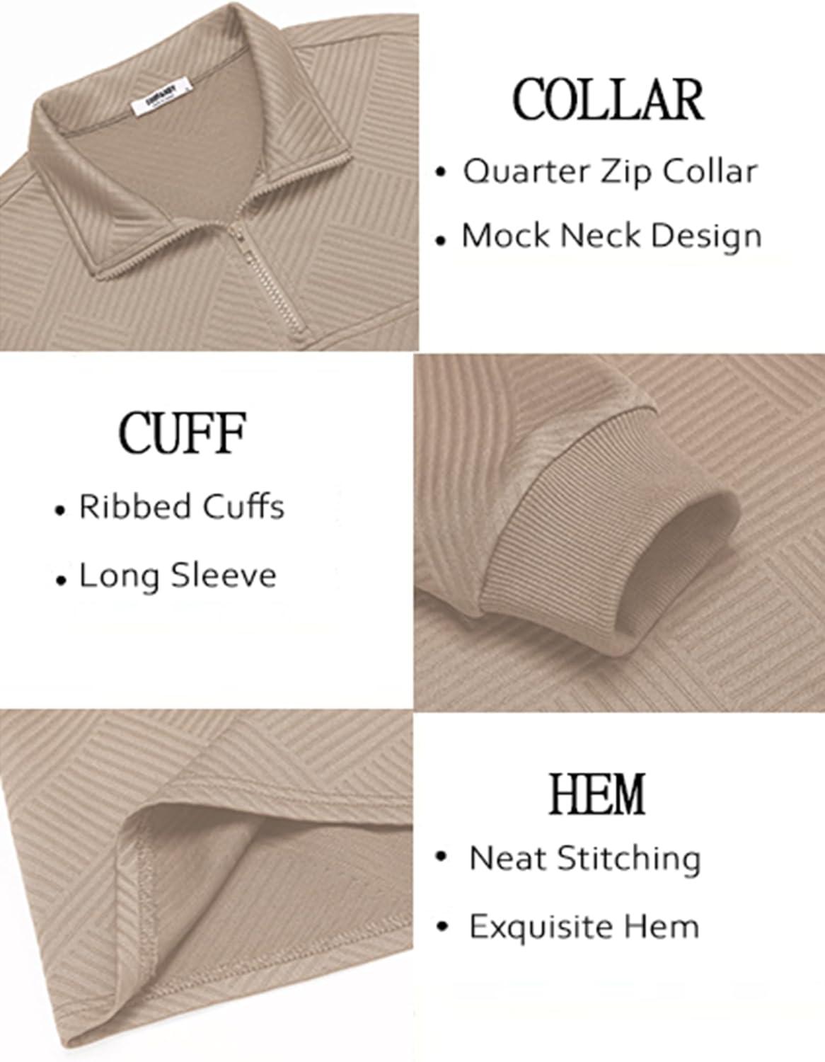 COOFANDY Men’s Quarter Zip Pullover Lightweight Textured T-Shirts Long Sleeve Casual Mock Neck Polo Shirts(Khaki)