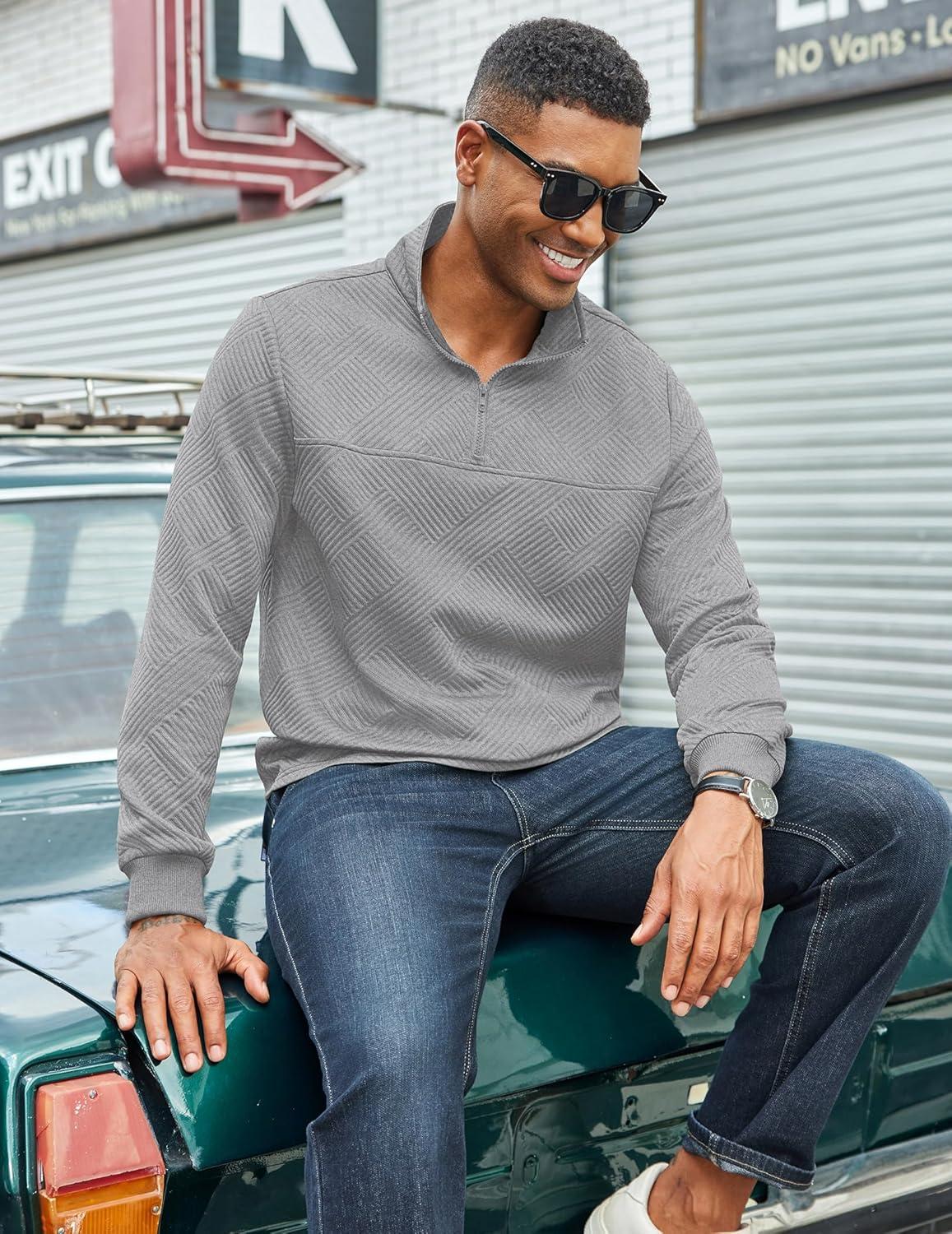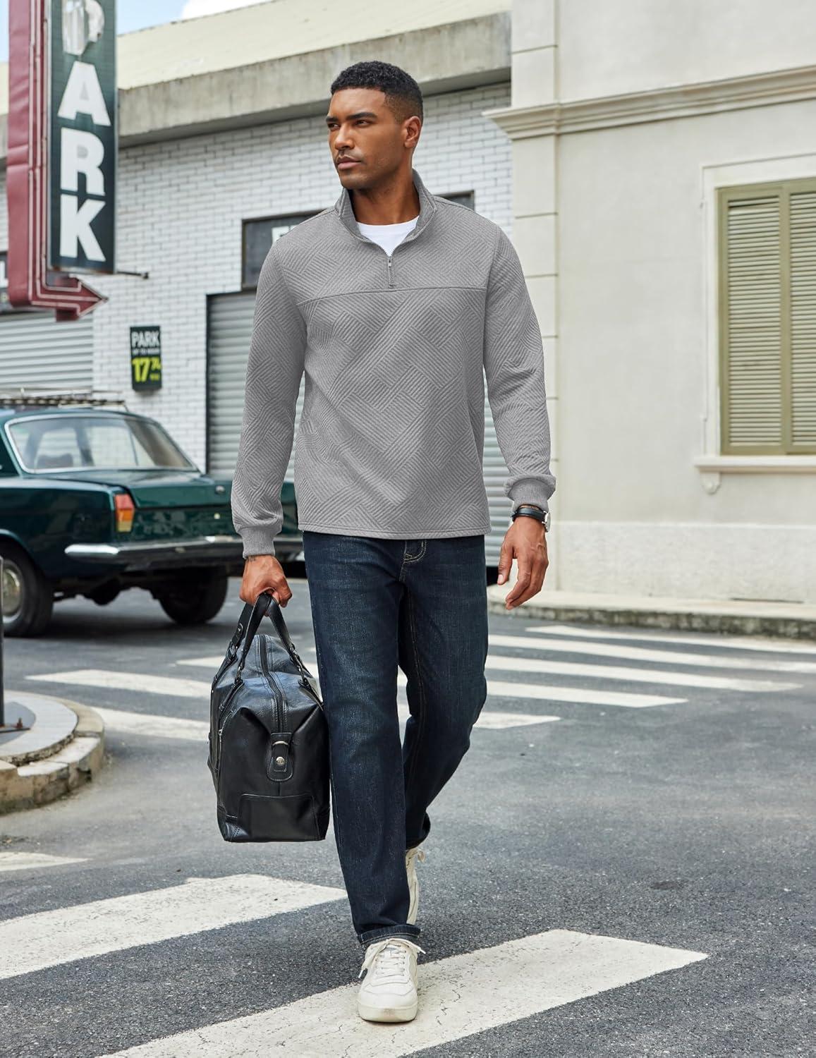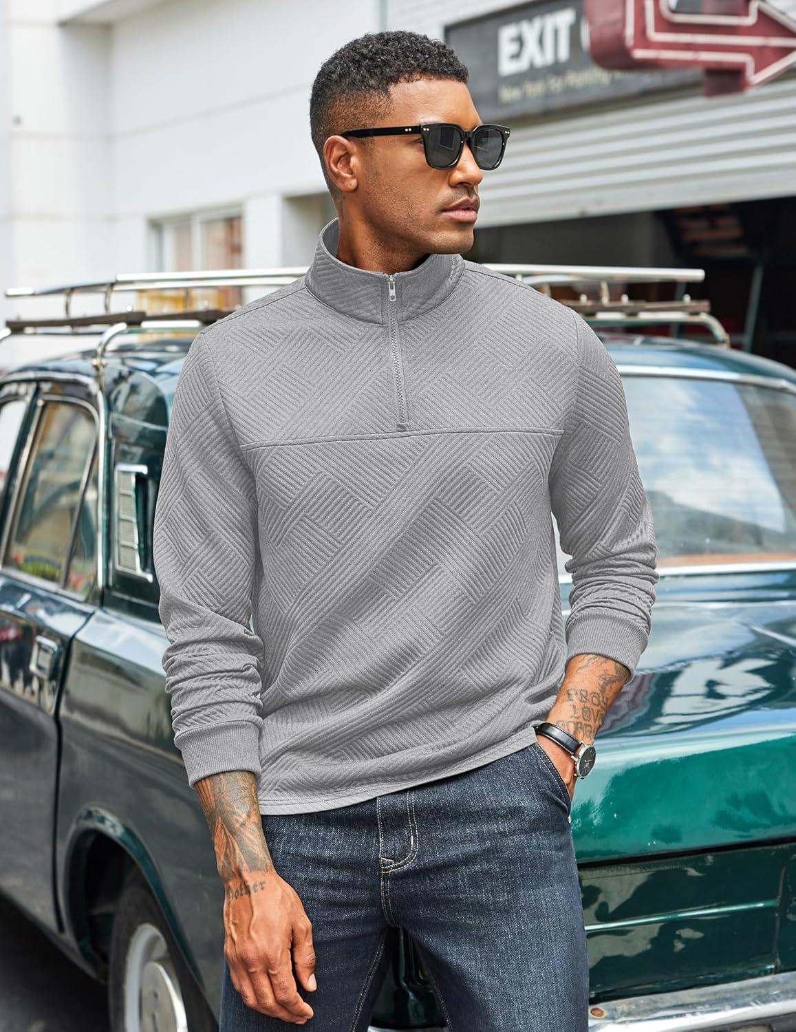 COOFANDY Men’s Quarter Zip Pullover Lightweight Textured T-Shirts Long Sleeve Casual Mock Neck Polo Shirts(Light Grey)