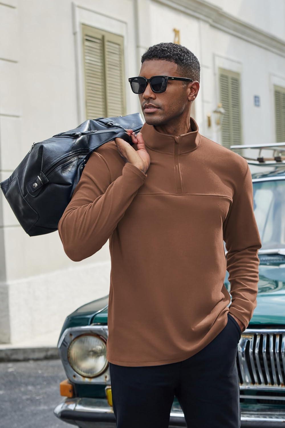 COOFANDY Mens Quarter Zip Pullover Long Sleeve Mock Turtleneck Sweatshirts Thermal Workout Golf Polo Shirt(Brown)