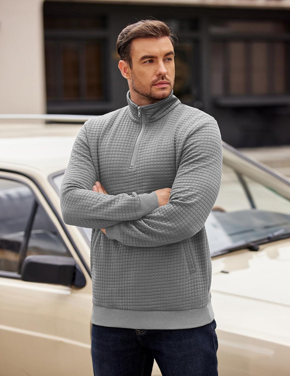 COOFANDY Mens Quarter Zip Pullover Long Sleeve Waffle Quilted Sweatshirt Casual Polo Sweaters with Pocket(Light Grey)
