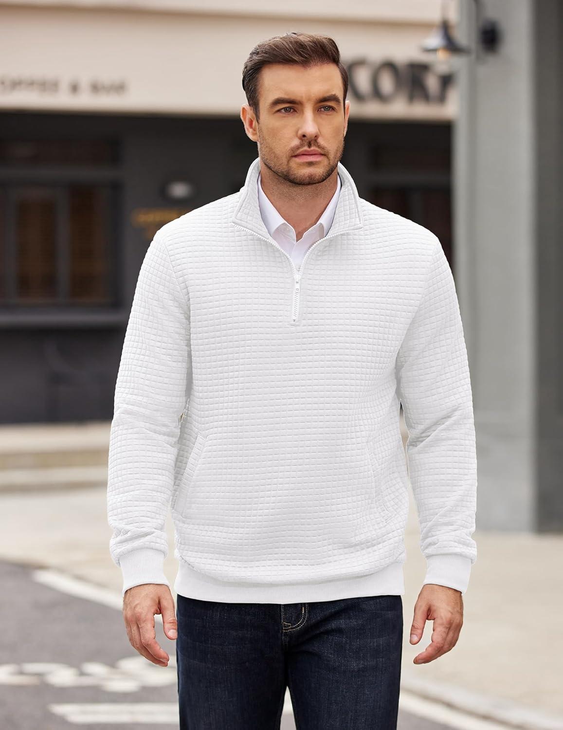 COOFANDY Mens Quarter Zip Pullover Long Sleeve Waffle Quilted Sweatshirt Casual Polo Sweaters with Pocket(White)