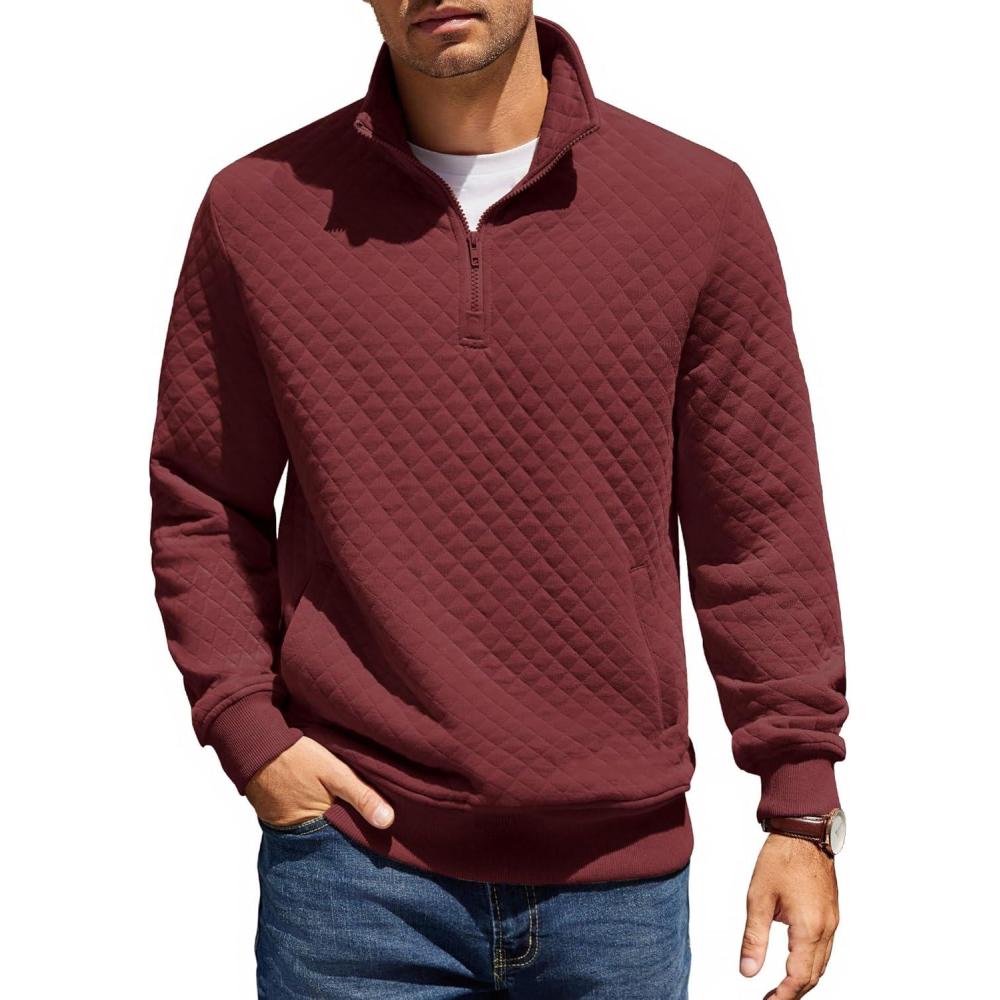 COOFANDY Mens Quarter Zip Pullover Quilted Sweatshirt Knit Long Sleeve Mock Neck Sweater Polo with Pocket(Red)