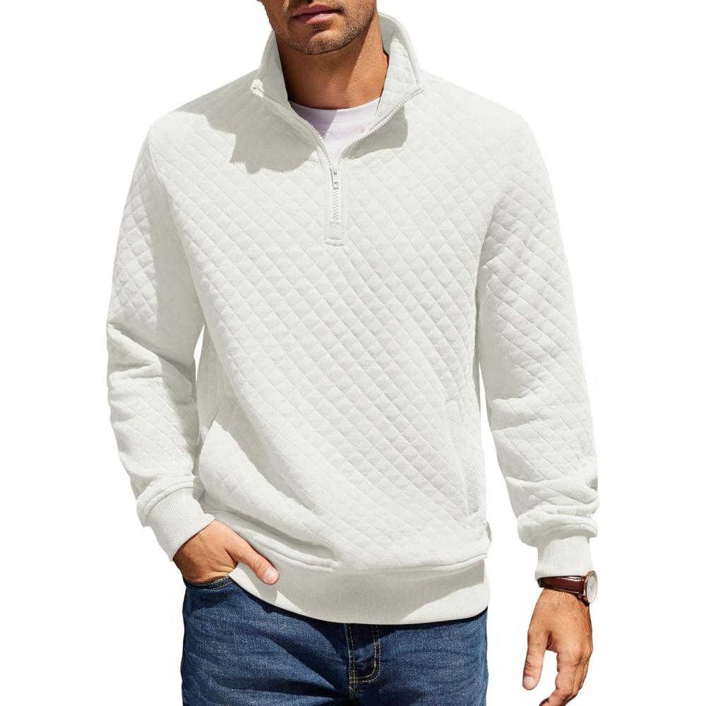COOFANDY Mens Quarter Zip Pullover Quilted Sweatshirt Knit Long Sleeve Mock Neck Sweater Polo with Pocket(White)