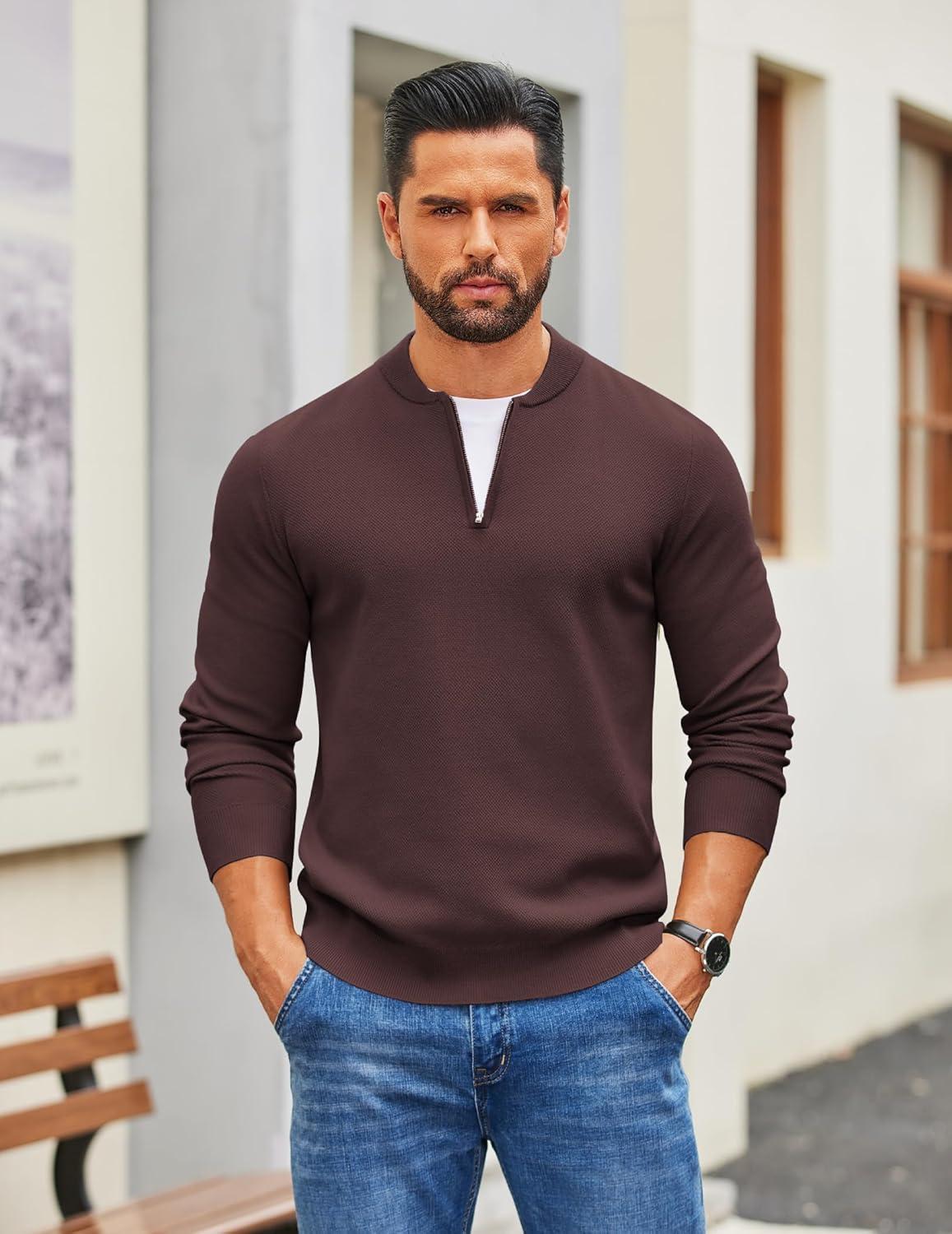 COOFANDY Mens Quarter Zip Pullover Slim Fit Knit Sweater Lightweight Mock Neck Casual Sweaters(Brown)