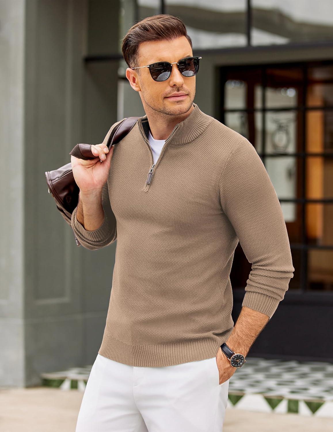 COOFANDY Men’s Quarter Zip Pullover Sweater Slim Fit Knit Mock Neck Polo Sweaters(Khaki)