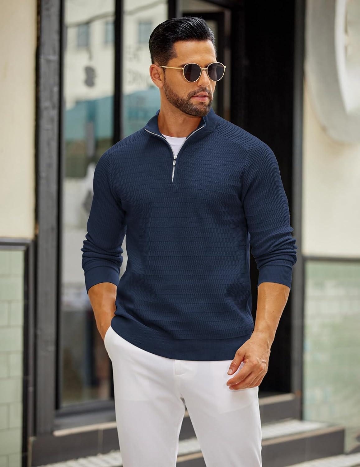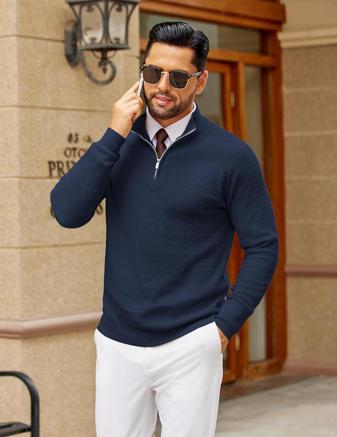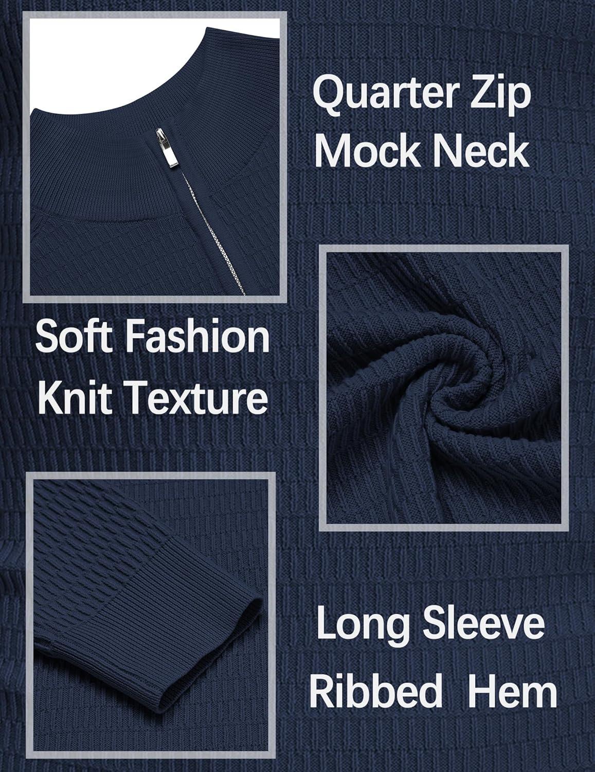 COOFANDY Men’s Quarter Zip Sweater Slim Fit Lightweight Mock Neck Pullover Knit Texture Polo Sweaters(Navy Blue)